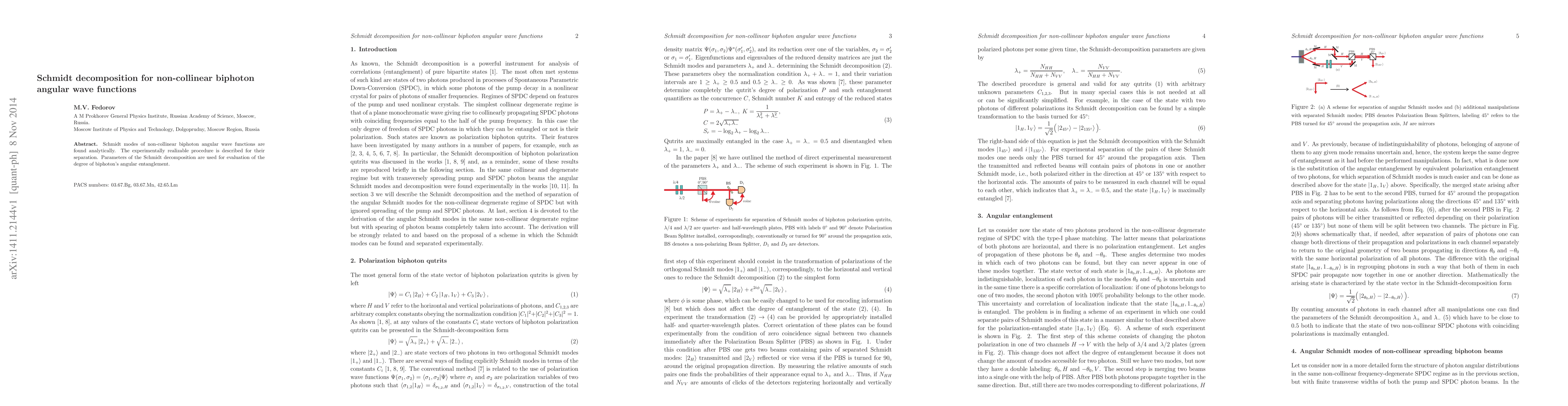 This paper analytically determines Schmidt modes for non-collinear biphoton angular wave functions and outlines a practical method for their separation, using Schmidt parameters to assess the degree of angular entanglement in biphotons.