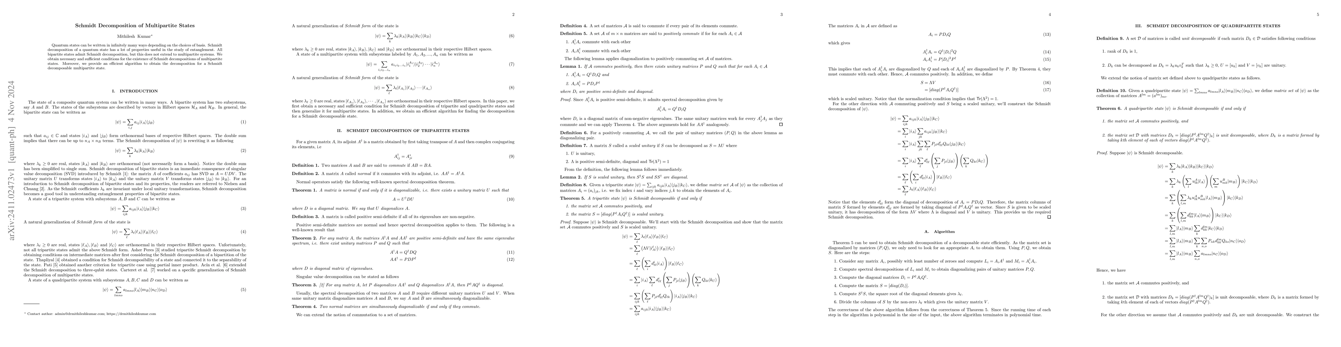 Summary: This paper establishes necessary and sufficient conditions for the Schmidt decomposition of multipartite quantum states and proposes an efficient algorithm to achieve this decomposition when it is possible, extending the concept beyond bipartite systems.
