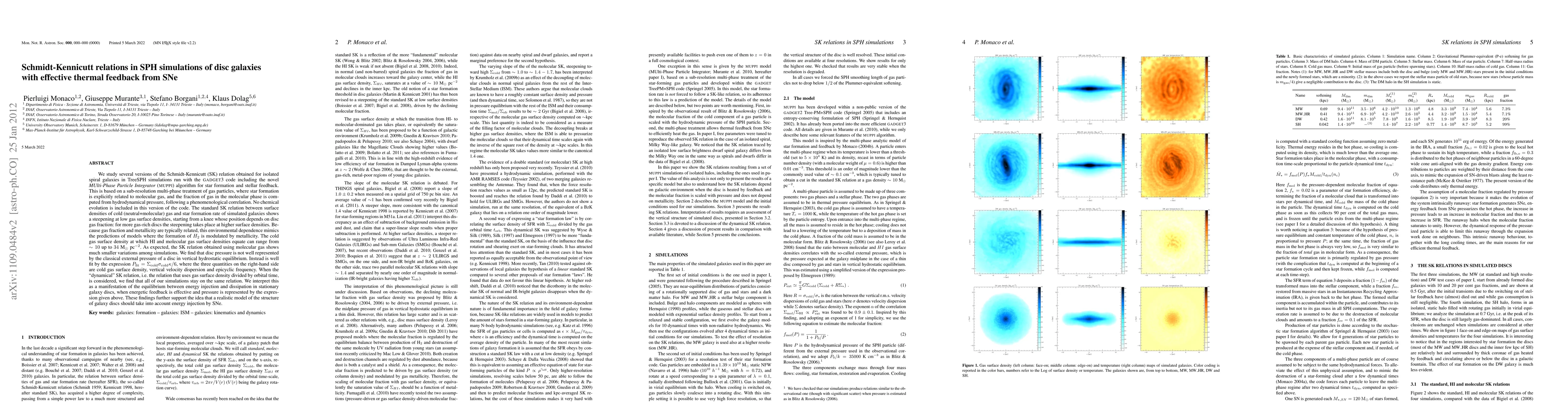 We study several versions of the Schmidt-Kennicutt (SK) relation obtained for isolated spiral galaxies in TreeSPH simulations run with the GADGET3 code including the novel MUlti-Phase Particle Integrator (MUPPI) algorithm for star formation and stellar feedback. [...] The standard SK relation between surface densities of cold (neutral+molecular) gas and star formation rate of simulated galaxies shows a steepening at low gas surface densities, starting from a knee whose position depends on disc gas fraction: for more gas-rich discs the steepening takes place at higher surface densities. Because gas fraction and metallicity are typically related, this environmental dependence mimics the predictions of models where the formation of H2 is modulated by metallicity. The cold gas surface density at which HI and molecular gas surface densities equate can range from ~10 up to 34 Msun/pc^2. As expected, the SK relation obtained using molecular gas shows much smaller variations among simulations. We find that disc pressure is not well represented by the classical external pressure of a disc in vertical hydrostatic equilibrium. Instead is well fit by the expression P_fit = Sigma_cold sigma_cold kappa / 6, where the three quantities on the right-hand side are cold gas surface density, vertical velocity dispersion and epicyclic frequency. When the "dynamical" SK relation, i.e. the relation that uses gas surface density divided by orbital time, is considered, we find that all of our simulations stay on the same relation. We interpret this as a manifestation of the equilibrium between energy injection and dissipation in stationary galaxy discs, when energetic feedback is effective and pressure is represented by the expression given above. These findings further support the idea that a realistic model of the structure of galaxy discs should take into account energy injection by SNe. [Abridged]