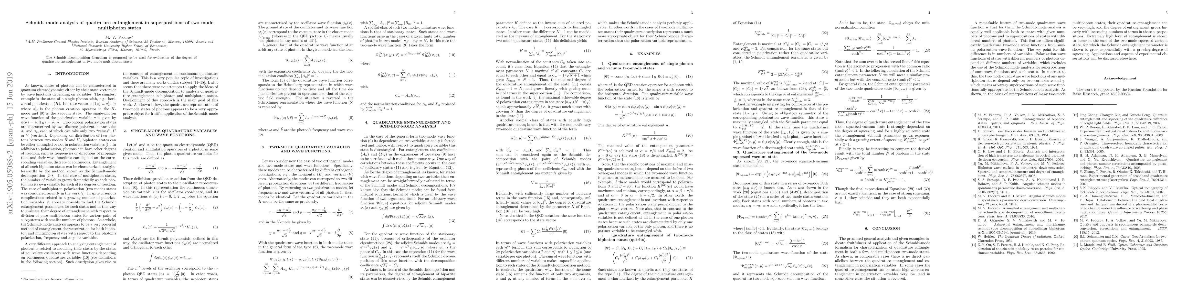 Summary: This paper utilizes the Schmidt-decomposition method to assess the degree of quadrature entanglement in superpositions of two-mode multiphoton states, providing a novel approach to quantify entanglement in complex quantum systems.