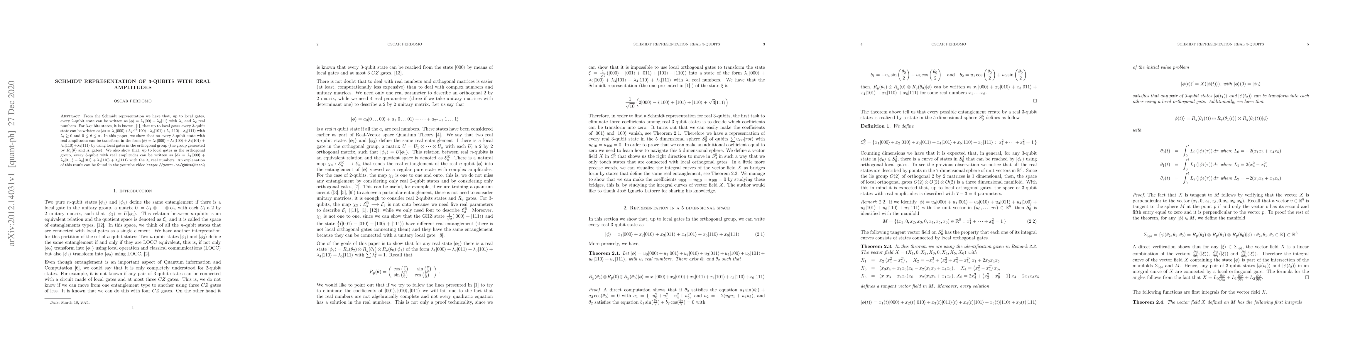 From the Schmidt representation we have that, up to local gates, every 2-qubit state can be written as $[\phi\rangle=\lambda_1 [00\rangle+\lambda_2 [11\rangle$ with $\lambda_1$ and $\lambda_2$ real numbers. For 3-qubits states, it is known, PRL 2000 85, that up to local gates every 3-qubit state can be written as $[\phi\rangle=\lambda_1 [000\rangle+\lambda_2 e^{i \theta }[100\rangle+\lambda_3[101\rangle+\lambda_4[110\rangle+\lambda_5[111\rangle$ with $\lambda_i\ge0$ and $0\le \theta \le \pi$. In this paper, we show that no every 3-qubit state with real amplitudes can be transform in the form $[\phi\rangle=\lambda_1 [000\rangle+\lambda_2 [100\rangle+\lambda_3[101\rangle+\lambda_4[110\rangle+\lambda_5[111\rangle$ by using local gates in the orthogonal group (the group generated by $R_y(\theta)$ and $X$ gates). We also show that, up to local gates in the orthogonal group, every 3-qubit with real amplitudes can be written as $[\phi\rangle=\lambda_1 [000\rangle+\lambda_2 [011\rangle+\lambda_3[101\rangle+\lambda_4[110\rangle+\lambda_5[111\rangle$ with the $\lambda_i$ real numbers. An explanation of this result can be found in the youtube video \url{https://youtu.be/gDN20QHzsoQ}