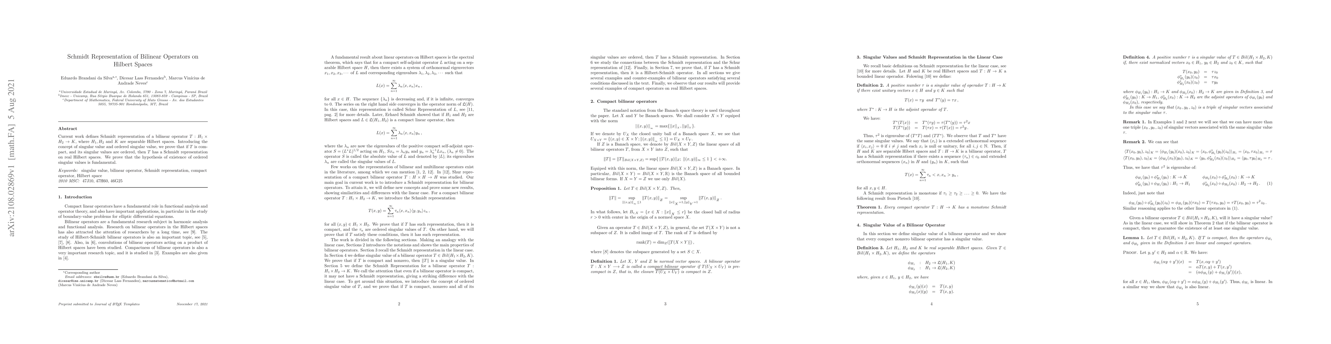 Current work defines Schmidt representation of a bilinear operator $T: H_1 \times H_2 \rightarrow K$, where $H_1, H_2$ and $K$ are separable Hilbert spaces. Introducing the concept of singular value and ordered singular value, we prove that if $T$ is compact, and its singular values are ordered, then $T$ has a Schmidt representation on real Hilbert spaces. We prove that the hypothesis of existence of ordered singular values is fundamental.