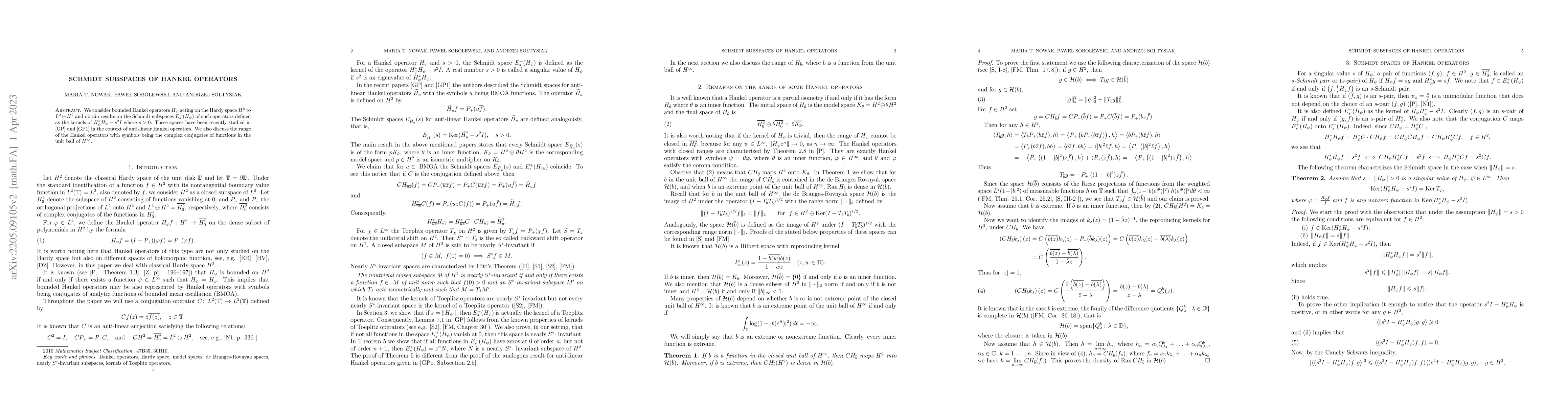 We consider bounded Hankel operators $H_{\psi}$ acting on the Hardy space $H^2$ to $L^2\ominus H^2$ and obtain results on the Schmidt subspaces $E^+_s(H_\psi)$ of such operators defined as the kernels of $ H_{\psi}^{\ast}H_{\psi}-s^2I$ where $s>0$. These spaces have been recently studied in \cite{GP} and \cite{GP1} in the context of anti-linear Hankel operators. We also discuss the range of the Hankel operators with symbols being the complex conjugates of functions in the unit ball of $H^{\infty}$.