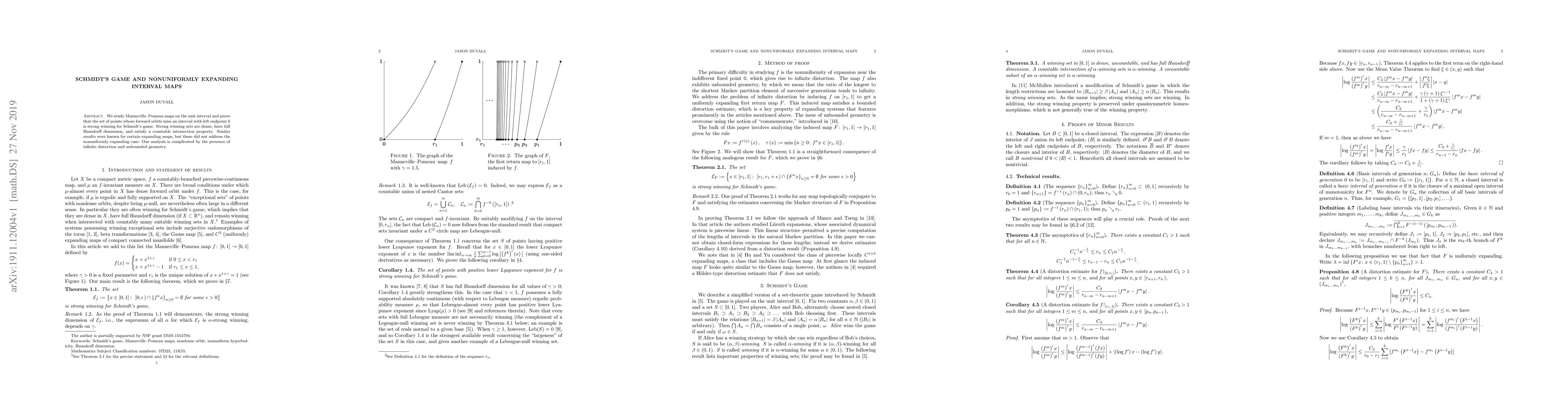 We study Manneville-Pomeau maps on the unit interval and prove that the set of points whose forward orbits miss an interval with left endpoint 0 is strong winning for Schmidt's game. Strong winning sets are dense, have full Hausdorff dimension, and satisfy a countable intersection property. Similar results were known for certain expanding maps, but these did not address the nonuniformly expanding case. Our analysis is complicated by the presence of infinite distortion and unbounded geometry.