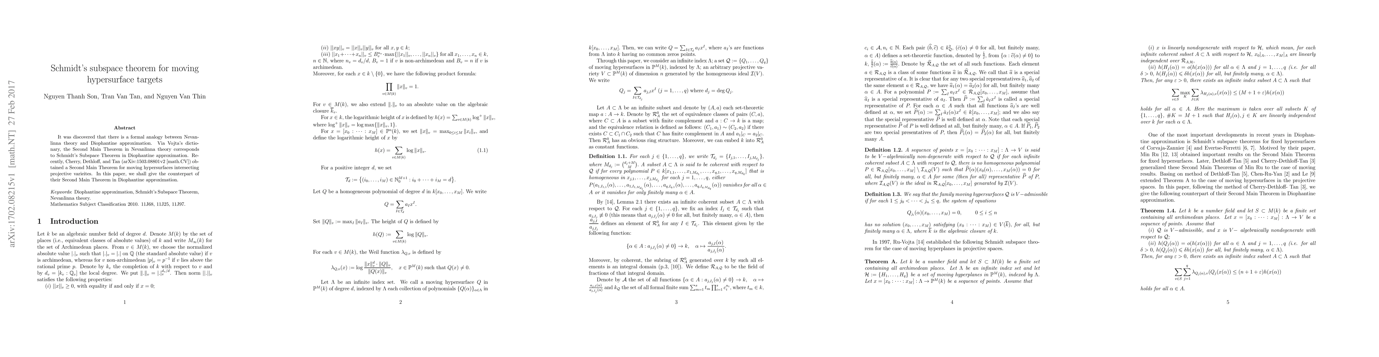 It was discovered that there is a formal analogy between Nevanlinna theory and Diophantine approximation. Via Vojta's dictionary, the Second Main Theorem in Nevanlinna theory corresponds to Schmidt's Subspace Theorem in Diophantine approximation. Recently, Cherry, Dethloff, and Tan (arXiv:1503.08801v2 [math.CV]) obtained a Second Main Theorem for moving hypersurfaces intersecting projective varieites. In this paper, we shall give the counterpart of their Second Main Theorem in Diophantine approximation.