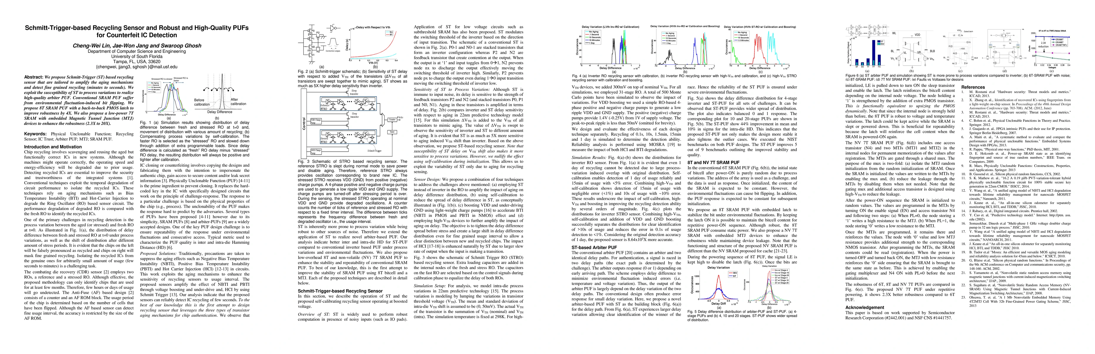 This paper proposes a Schmitt-Trigger-based recycling sensor to detect fine-grained recycling in ICs and introduces robust PUFs to counter environmental fluctuations. It enhances PUF robustness using an 8T SRAM PUF with a back-to-back PMOS latch and a low-power 7T SRAM with embedded MTJ devices.