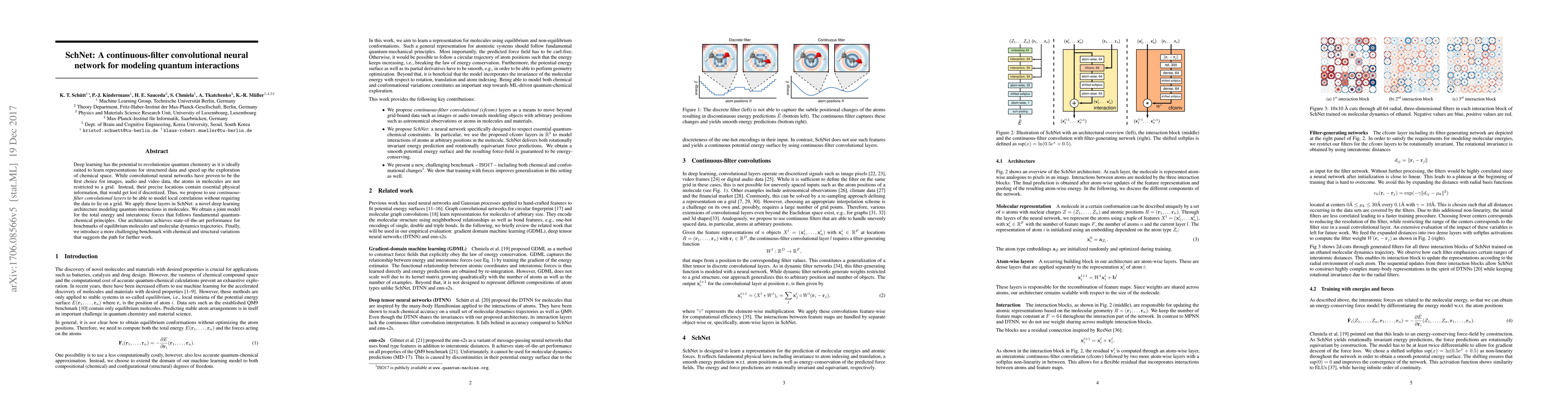 Deep learning has the potential to revolutionize quantum chemistry as it is ideally suited to learn representations for structured data and speed up the exploration of chemical space. While convolutional neural networks have proven to be the first choice for images, audio and video data, the atoms in molecules are not restricted to a grid. Instead, their precise locations contain essential physical information, that would get lost if discretized. Thus, we propose to use continuous-filter convolutional layers to be able to model local correlations without requiring the data to lie on a grid. We apply those layers in SchNet: a novel deep learning architecture modeling quantum interactions in molecules. We obtain a joint model for the total energy and interatomic forces that follows fundamental quantum-chemical principles. This includes rotationally invariant energy predictions and a smooth, differentiable potential energy surface. Our architecture achieves state-of-the-art performance for benchmarks of equilibrium molecules and molecular dynamics trajectories. Finally, we introduce a more challenging benchmark with chemical and structural variations that suggests the path for further work.