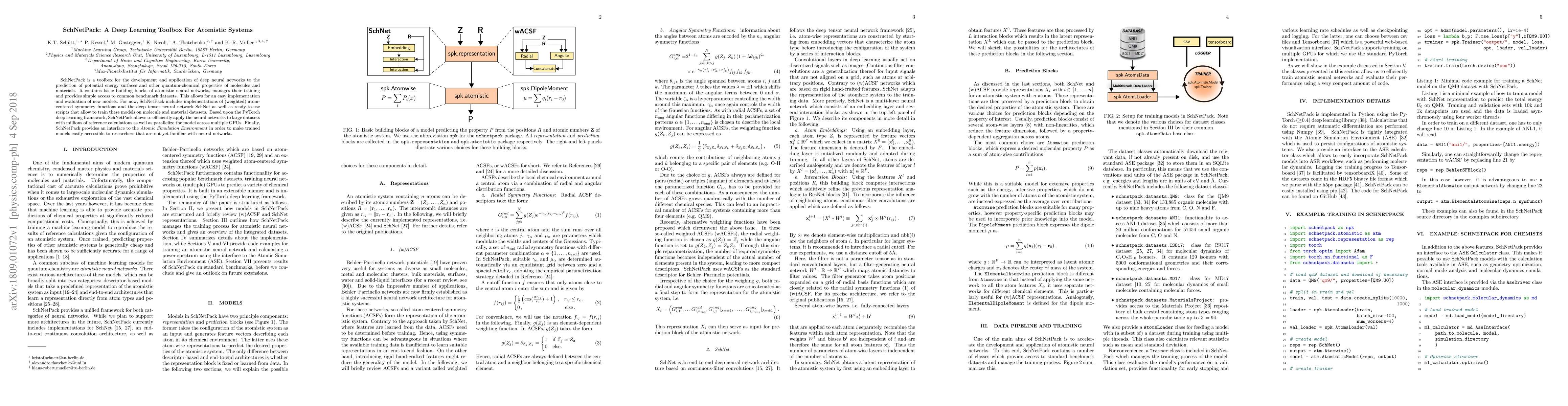 SchNetPack is a deep learning toolbox for atomistic systems, providing building blocks, training management, and access to benchmark datasets for predicting potential energy surfaces and quantum-chemical properties of molecules and materials. It utilizes the PyTorch framework, enabling efficient application to large datasets and parallelization across multiple GPUs.