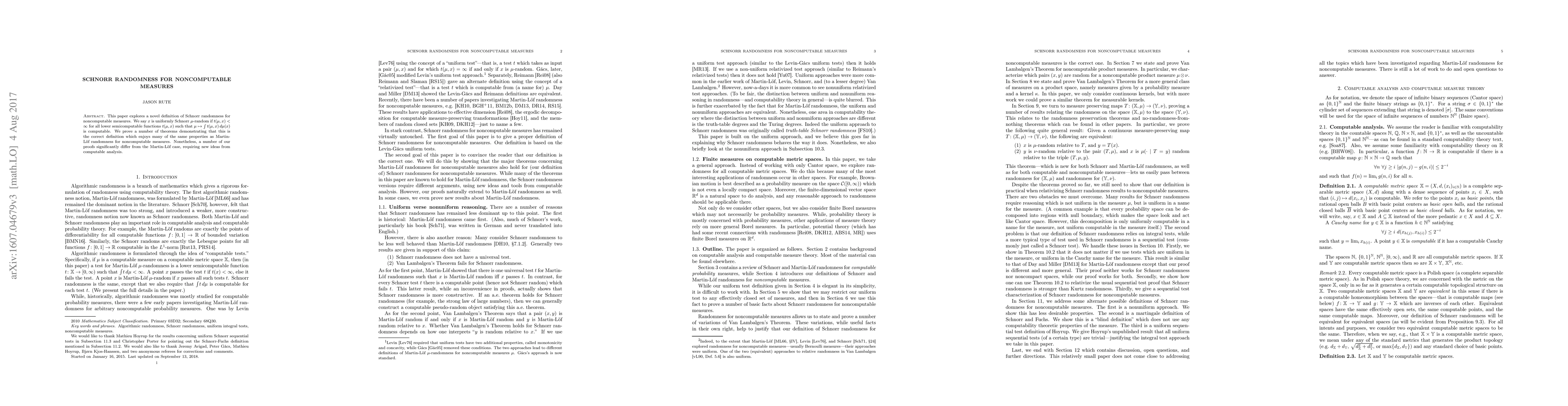 This paper introduces a new definition of Schnorr randomness for noncomputable measures and proves it shares properties with Martin-Löf randomness, though it requires novel techniques from computable analysis for its proofs.