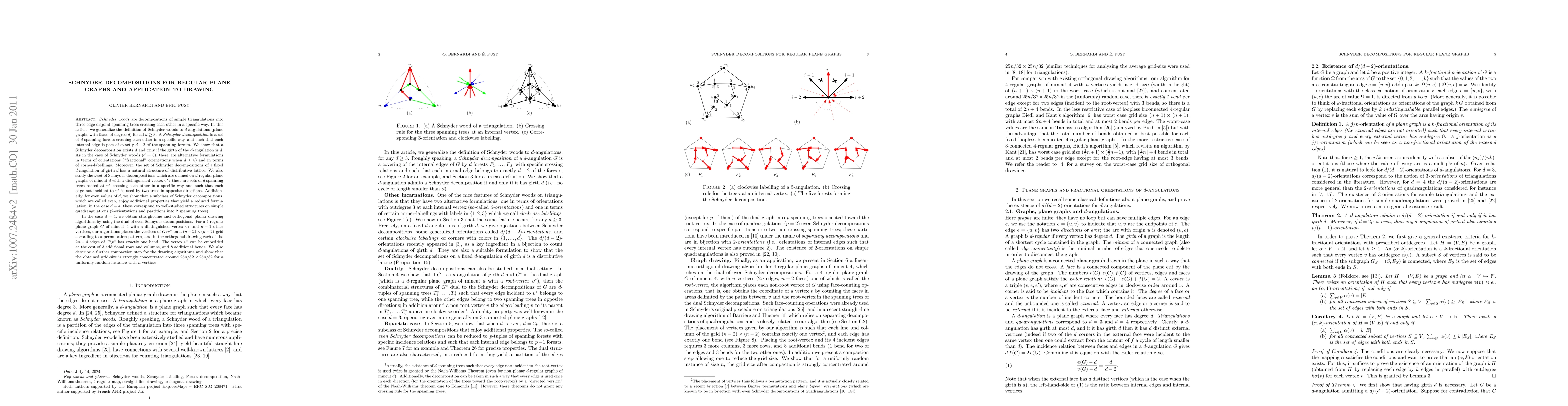 Schnyder woods are decompositions of simple triangulations into three edge-disjoint spanning trees crossing each other in a specific way. In this article, we define a generalization of Schnyder woods to $d$-angulations (plane graphs with faces of degree $d$) for all $d\geq 3$. A \emph{Schnyder decomposition} is a set of $d$ spanning forests crossing each other in a specific way, and such that each internal edge is part of exactly $d-2$ of the spanning forests. We show that a Schnyder decomposition exists if and only if the girth of the $d$-angulation is $d$. As in the case of Schnyder woods ($d=3$), there are alternative formulations in terms of orientations ("fractional" orientations when $d\geq 5$) and in terms of corner-labellings. Moreover, the set of Schnyder decompositions on a fixed $d$-angulation of girth $d$ is a distributive lattice. We also show that the structures dual to Schnyder decompositions (on $d$-regular plane graphs of mincut $d$ rooted at a vertex $v^*$) are decompositions into $d$ spanning trees rooted at $v^*$ such that each edge not incident to $v^*$ is used in opposite directions by two trees. Additionally, for even values of $d$, we show that a subclass of Schnyder decompositions, which are called even, enjoy additional properties that yield a reduced formulation; in the case d=4, these correspond to well-studied structures on simple quadrangulations (2-orientations and partitions into 2 spanning trees). In the case d=4, the dual of even Schnyder decompositions yields (planar) orthogonal and straight-line drawing algorithms. For a 4-regular plane graph $G$ of mincut 4 with $n$ vertices plus a marked vertex $v$, the vertices of $G\backslash v$ are placed on a $(n-1) \times (n-1)$ grid according to a permutation pattern, and in the orthogonal drawing each of the $2n-2$ edges of $G\backslash v$ has exactly one bend. Embedding also the marked vertex $v$ is doable at the cost of two additional rows and columns and 8 additional bends for the 4 edges incident to $v$. We propose a further compaction step for the drawing algorithm and show that the obtained grid-size is strongly concentrated around $25n/32\times 25n/32$ for a uniformly random instance with $n$ vertices.