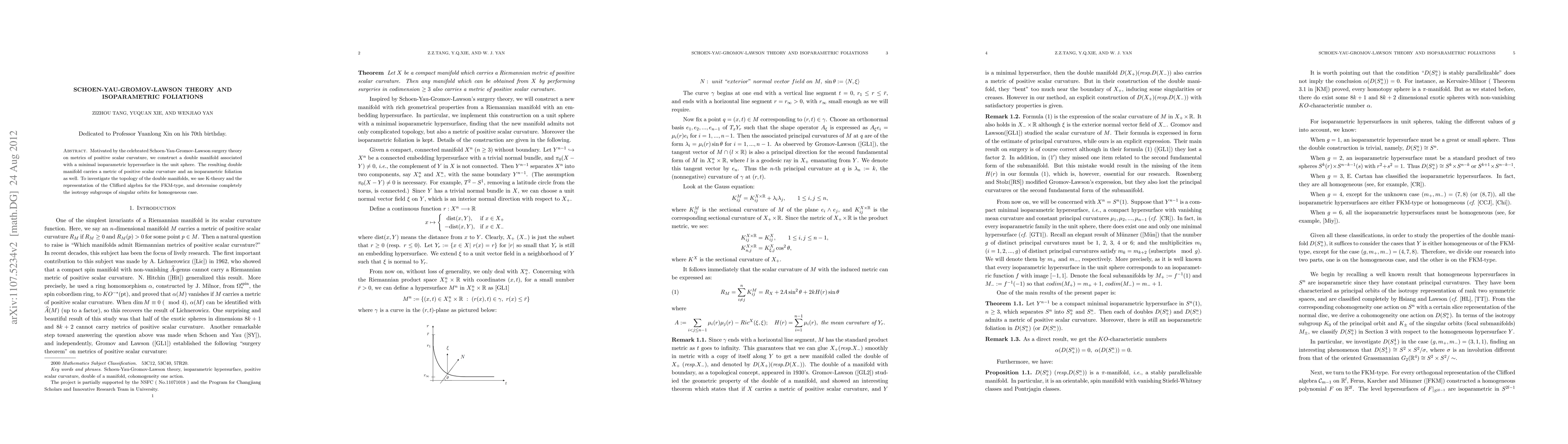 This paper constructs a double manifold linked to a minimal isoparametric hypersurface in the unit sphere, showing it carries metrics of positive scalar curvature and an isoparametric foliation. The authors use K-theory and Clifford algebra representations to investigate the topology, fully determining the isotropy subgroups for homogeneous cases.