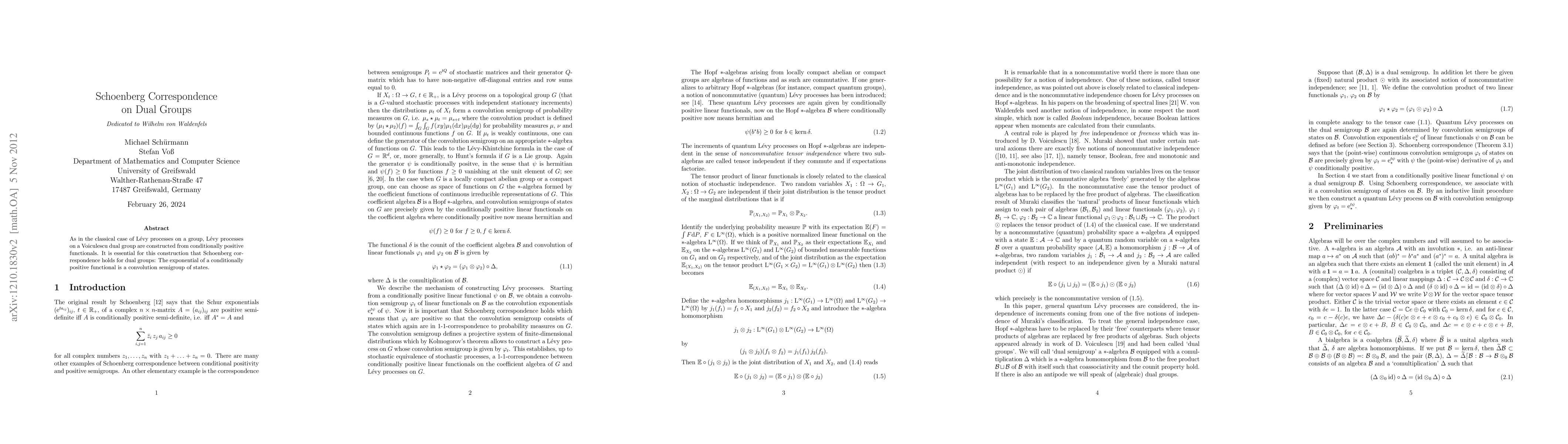 A paper explores how Schoenberg correspondence applies to dual groups in Voiculescu theory, enabling the construction of Lévy processes from conditionally positive functionals. This allows for the exponential of such functionals to be used as convolution semigroups of states.