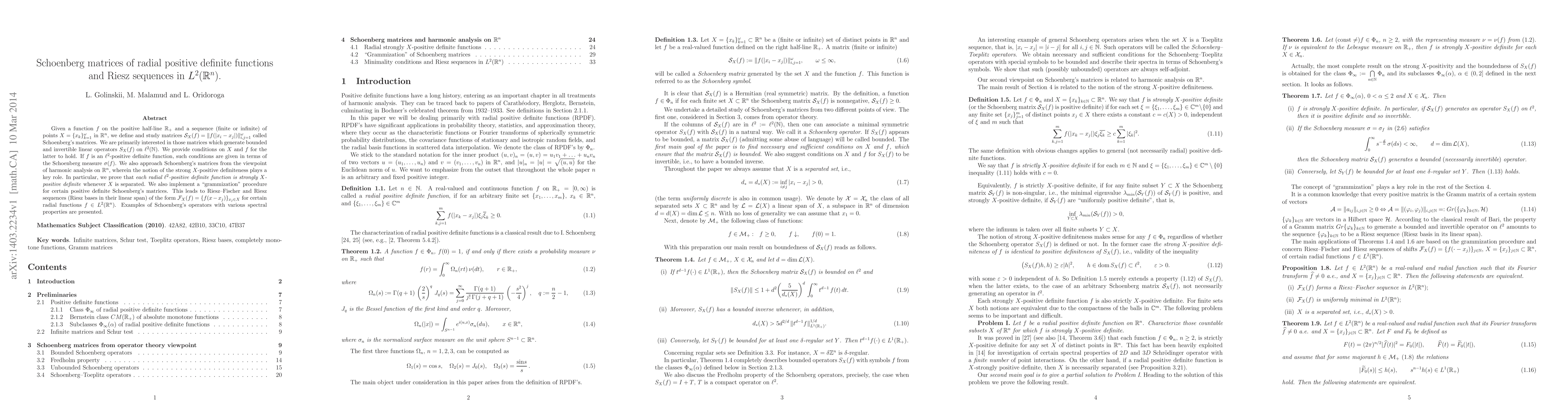 Given a function $f$ on the positive half-line $\R_+$ and a sequence (finite or infinite) of points $X=\{x_k\}_{k=1}^\omega$ in $\R^n$, we define and study matrices $\kS_X(f)=\|f(|x_i-x_j|)\|_{i,j=1}^\omega$ called Schoenberg's matrices. We are primarily interested in those matrices which generate bounded and invertible linear operators $S_X(f)$ on $\ell^2(\N)$. We provide conditions on $X$ and $f$ for the latter to hold. If $f$ is an $\ell^2$-positive definite function, such conditions are given in terms of the Schoenberg measure $\sigma(f)$. We also approach Schoenberg's matrices from the viewpoint of harmonic analysis on $\R^n$, wherein the notion of the strong $X$-positive definiteness plays a key role. In particular, we prove that \emph{each radial $\ell^2$-positive definite function is strongly $X$-positive definite} whenever $X$ is separated. We also implement a "grammization" procedure for certain positive definite Schoenberg's matrices. This leads to Riesz--Fischer and Riesz sequences (Riesz bases in their linear span) of the form $\kF_X(f)=\{f(x-x_j)\}_{x_j\in X}$ for certain radial functions $f\in L^2(\R^n)$. Examples of Schoenberg's operators with various spectral properties are presented.