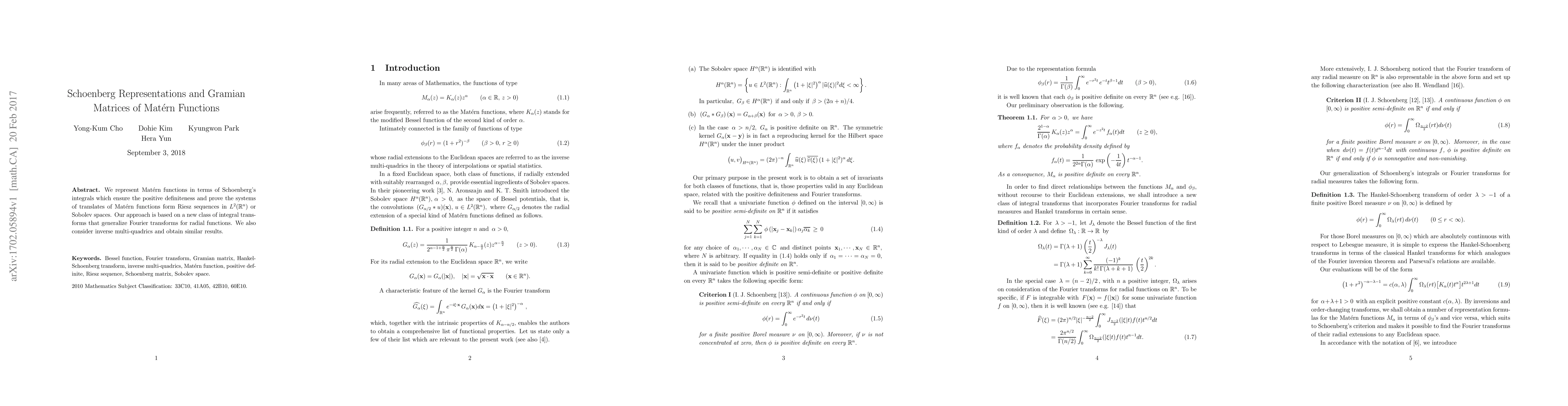 This paper represents Mat\'ern functions using Schoenberg integrals to ensure positive definiteness and proves that their translates form Riesz sequences in $L^2(\R^n)$ or Sobolev spaces. The study introduces a new class of integral transforms that generalize Fourier transforms for radial functions.