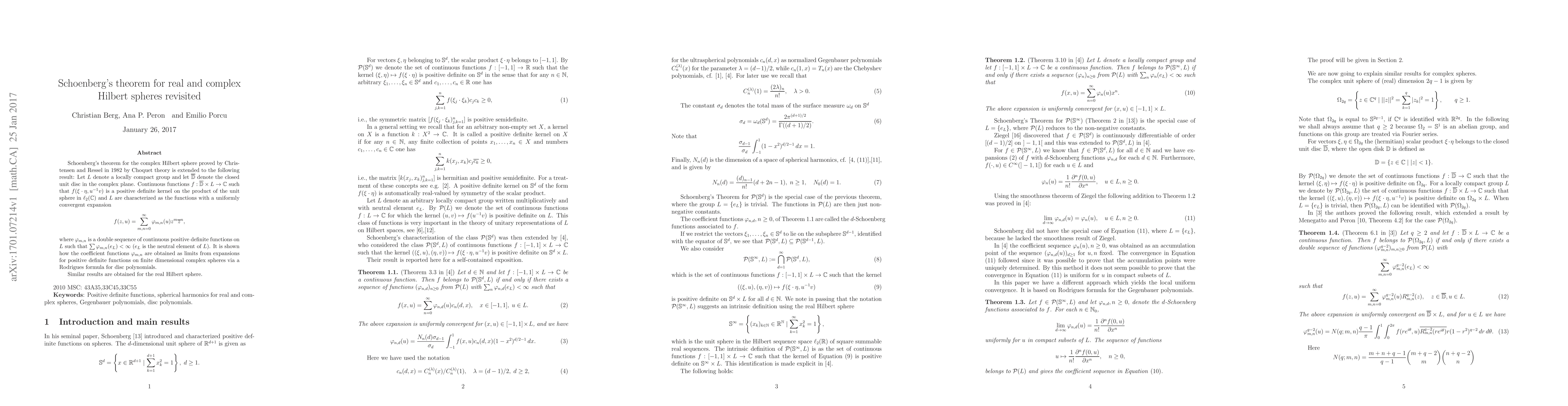 This research paper extends Schoenberg's theorem to real and complex Hilbert spheres, characterizing continuous functions on the product of unit sphere in ∞_2(π) and a locally compact group as those with uniformly convergent expansions featuring positive definite kernel functions.