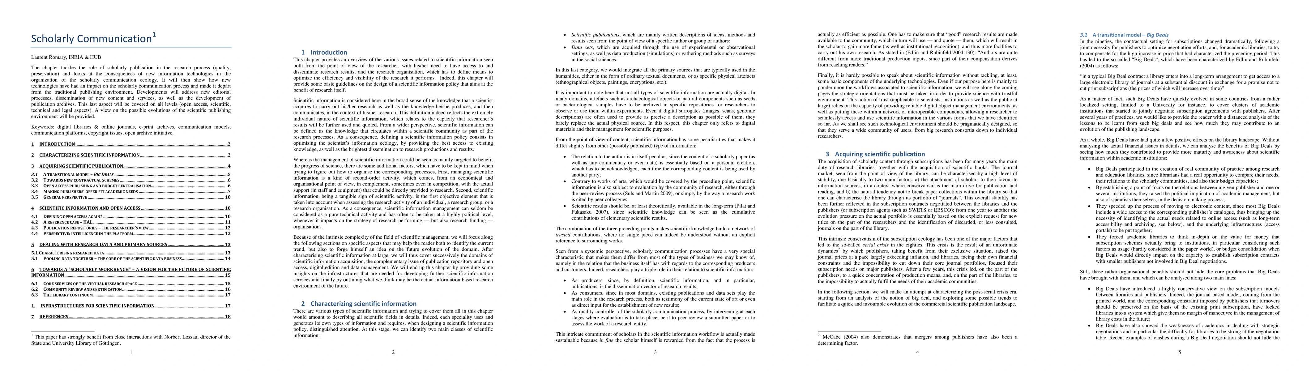 The chapter tackles the role of scholarly publication in the research process (quality, preservation) and looks at the consequences of new information technologies in the organization of the scholarly communication ecology. It will then show how new technologies have had an impact on the scholarly communication process and made it depart from the traditional publishing environment. Developments will address new editorial processes, dissemination of new content and services, as well as the development of publication archives. This last aspect will be covered on all levels (open access, scientific, technical and legal aspects). A view on the possible evolutions of the scientific publishing environment will be provided.