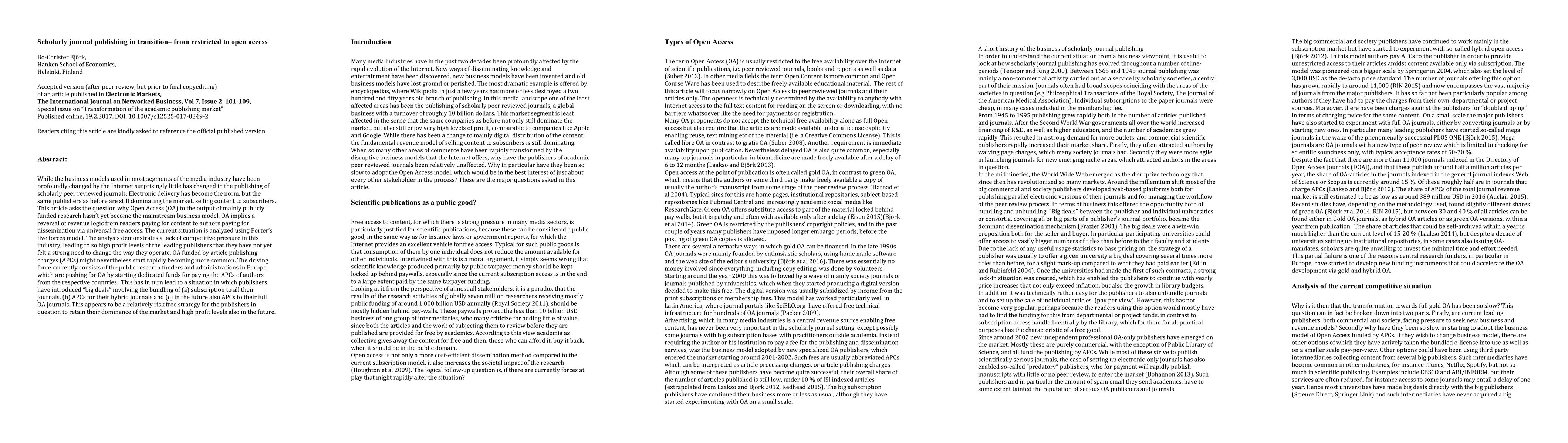 The publishing of scholarly peer-reviewed journals has changed little despite the internet's impact on media industries; Open Access models remain underutilized due to a lack of competitive pressure among dominant publishers.