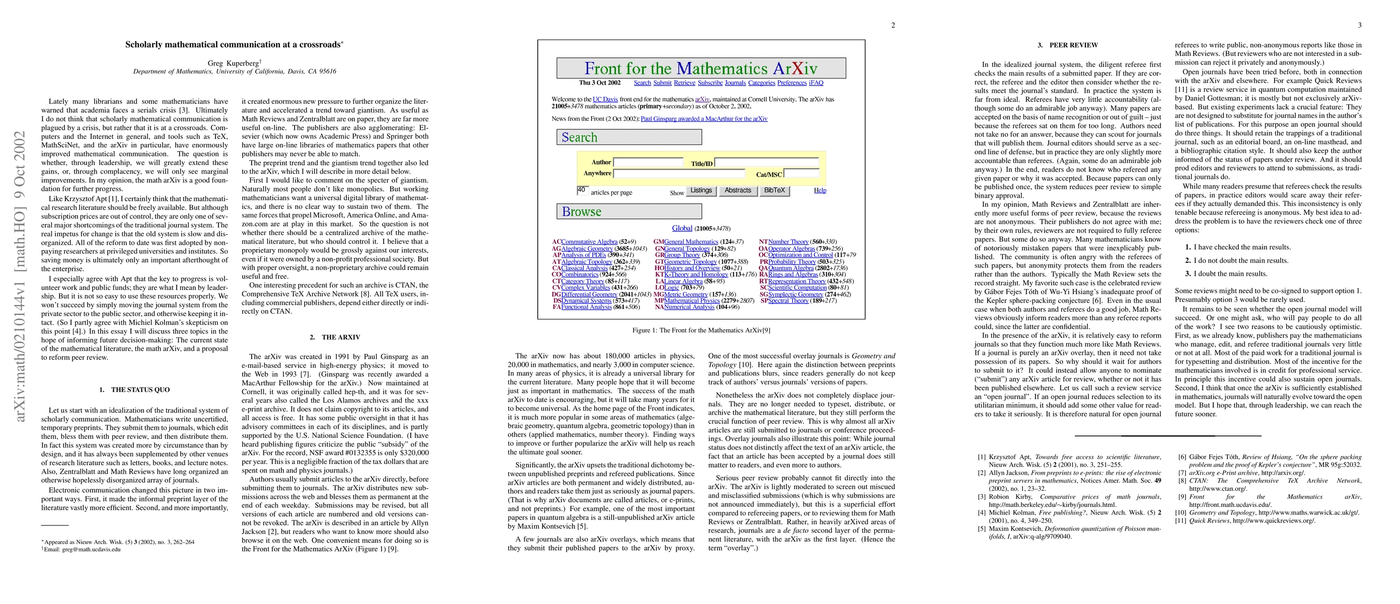 The paper discusses shifts in mathematical scholarly communication, examines the current status and goals of arXiv, and proposes a peer-review reform using arXiv as a basis.