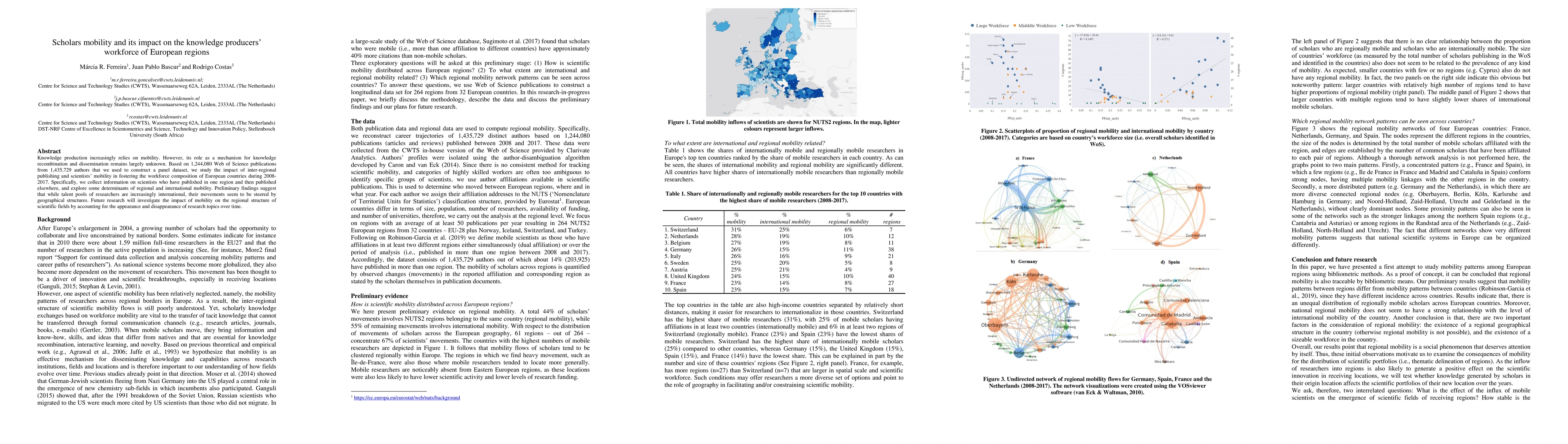 Knowledge production increasingly relies on mobility. However, its role as a mechanism for knowledge recombination and dissemination remains largely unknown. Based on 1,244,080 Web of Science publications from 1,435,729 authors that we used to construct a panel dataset, we study the impact of inter-regional publishing and scientists' mobility in fostering the workforce composition of European countries during 2008-2017. Specifically, we collect information on scientists who have published in one region and then published elsewhere, and explore some determinants of regional and international mobility. Preliminary findings suggest that while talent pools of researchers are increasingly international, their movements seem to be steered by geographical structures. Future research will investigate the impact of mobility on the regional structure of scientific fields by accounting for the appearance and disappearance of research topics over time.