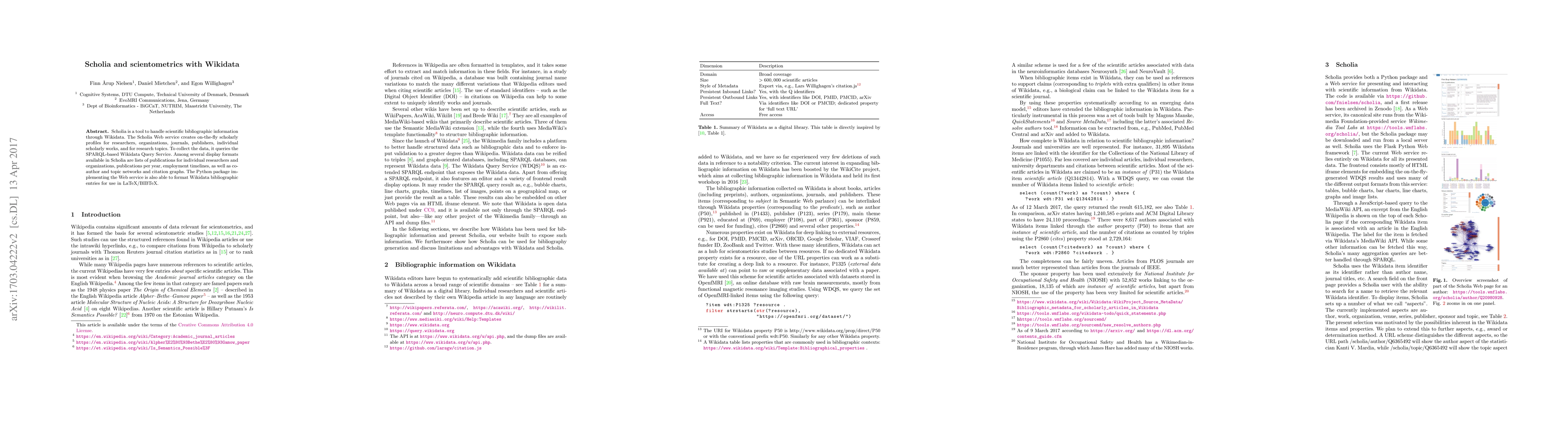Scholia is a tool to handle scientific bibliographic information in Wikidata. The Scholia Web service creates on-the-fly scholarly profiles for researchers, organizations, journals, publishers, individual scholarly works, and for research topics. To collect the data, it queries the SPARQL-based Wikidata Query Service. Among several display formats available in Scholia are lists of publications for individual researchers and organizations, publications per year, employment timelines, as well as co-author networks and citation graphs. The Python package implementing the Web service is also able to format Wikidata bibliographic entries for use in LaTeX/BIBTeX.