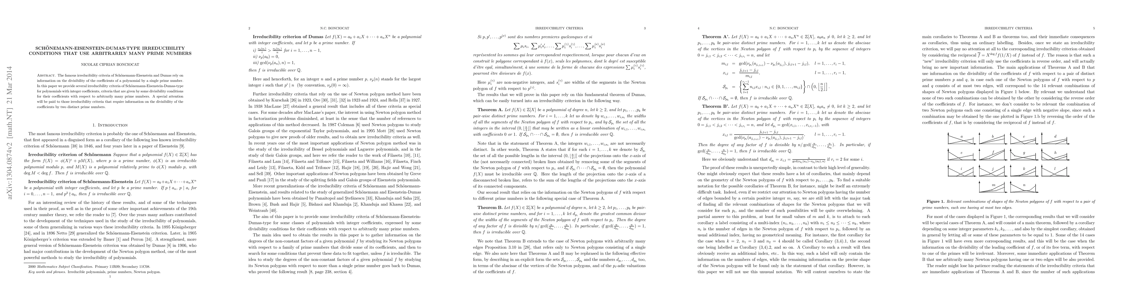 This paper introduces new irreducibility criteria for polynomials, extending the Sch\"onemann-Eisenstein-Dumas type to consider divisibility by multiple prime numbers, with a focus on conditions involving two distinct primes.