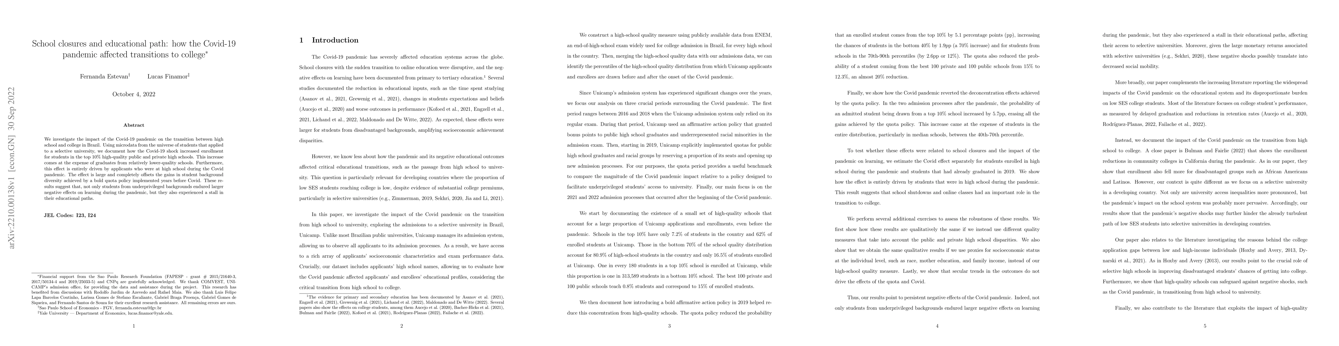 We investigate the impact of the Covid-19 pandemic on the transition between high school and college in Brazil. Using microdata from the universe of students that applied to a selective university, we document how the Covid-19 shock increased enrollment for students in the top 10% high-quality public and private high schools. This increase comes at the expense of graduates from relatively lower-quality schools. Furthermore, this effect is entirely driven by applicants who were at high school during the Covid pandemic. The effect is large and completely offsets the gains in student background diversity achieved by a bold quota policy implemented years before Covid. These results suggest that not only students from underprivileged backgrounds endured larger negative effects on learning during the pandemic, but they also experienced a stall in their educational paths.