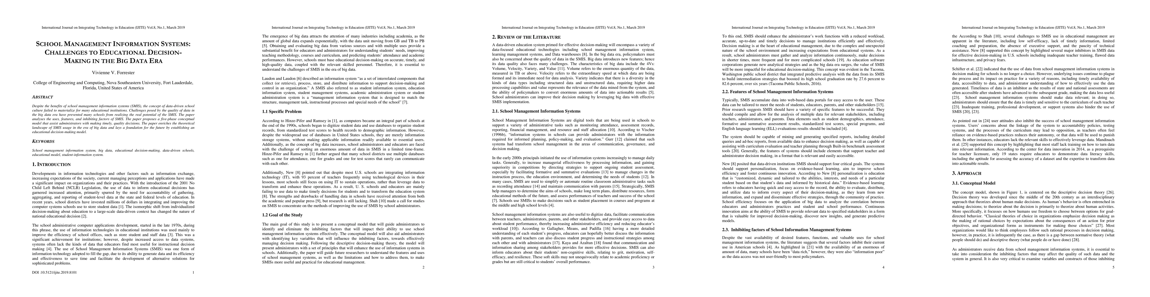 Despite the benefits of school management information systems (SMIS), the concept of data-driven school culture failed to materialize for many educational institutions. Challenges posed by the quality of data in the big data era have prevented many schools from realizing the real potential of the SMIS. The paper analyses the uses, features, and inhibiting factors of SMIS. The paper proposes a five-phase conceptual model that assist administrators with making timely, quality decisions. The paper enriches the theoretical landscape of SMIS usage in the era of big data and lays a foundation for the future by establishing an educational decision-making model.