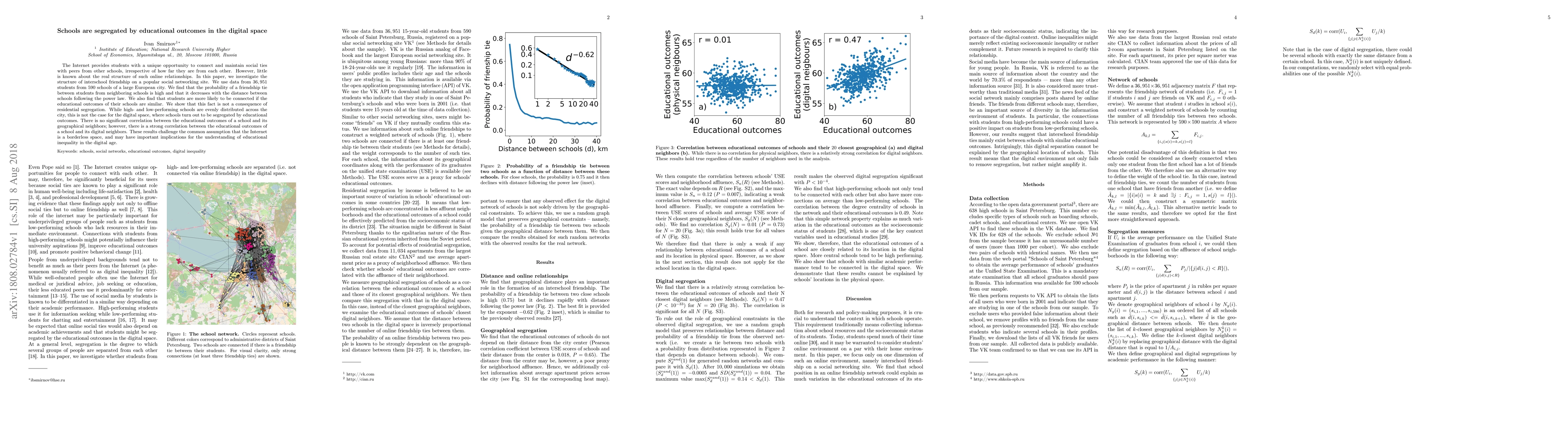 This study reveals that schools in a large European city are segregated by educational outcomes in the digital space, despite being evenly distributed geographically. The analysis of online friendships shows that students are more likely to connect with peers from schools with similar educational outcomes, challenging the notion of the Internet as a borderless space and highlighting potential implications for educational inequality.