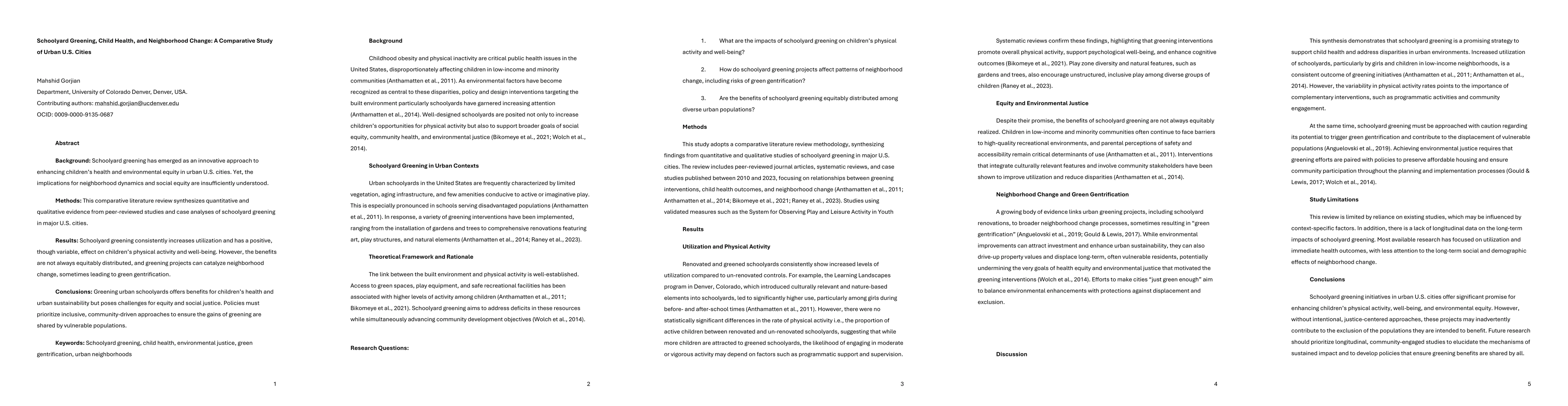 Background: Schoolyard greening has emerged as an innovative approach to enhancing childrens health and environmental equity in urban U.S. cities. Yet, the implications for neighborhood dynamics and social equity are insufficiently understood. Methods: This comparative literature review synthesizes quantitative and qualitative evidence from peer reviewed studies and case analyses of schoolyard greening in major U.S. cities. Results: Schoolyard greening consistently increases utilization and has a positive, though variable, effect on childrens physical activity and well-being. However, the benefits are not always equitably distributed, and greening projects can catalyze neighborhood change, sometimes leading to green gentrification. Conclusions: Greening urban schoolyards offers benefits for childrens health and urban sustainability but poses challenges for equity and social justice. Policies must prioritize inclusive, community driven approaches to ensure the gains of greening are shared by vulnerable populations.