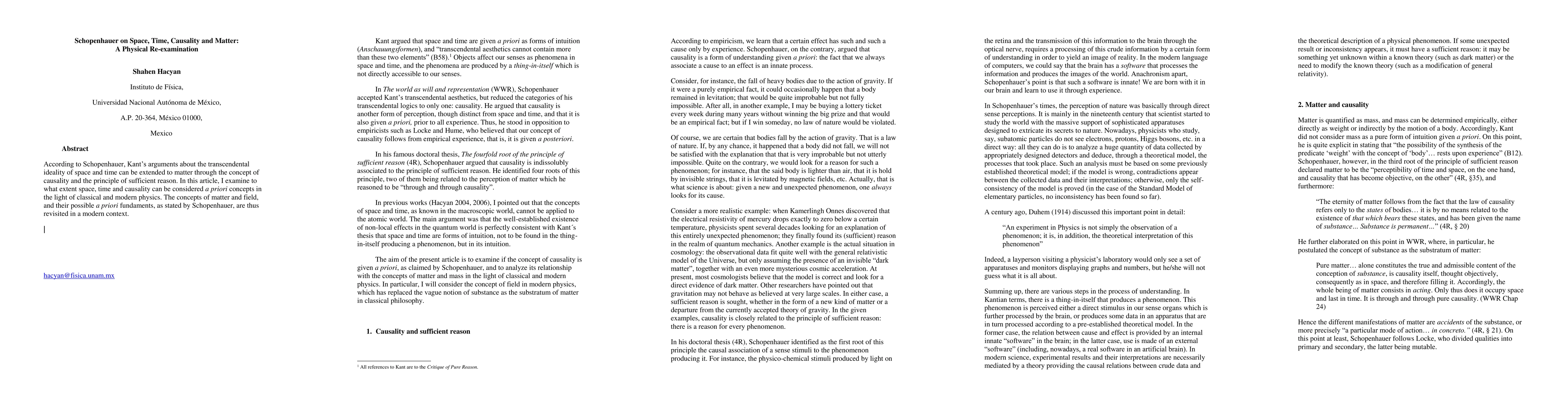Schopenhauer's extension of Kant's transcendental idealism to space, time, and matter via causality is re-examined in light of classical and modern physics. The study explores whether these concepts can be considered a priori, revisiting Schopenhauer's views on matter and fields in a contemporary context.