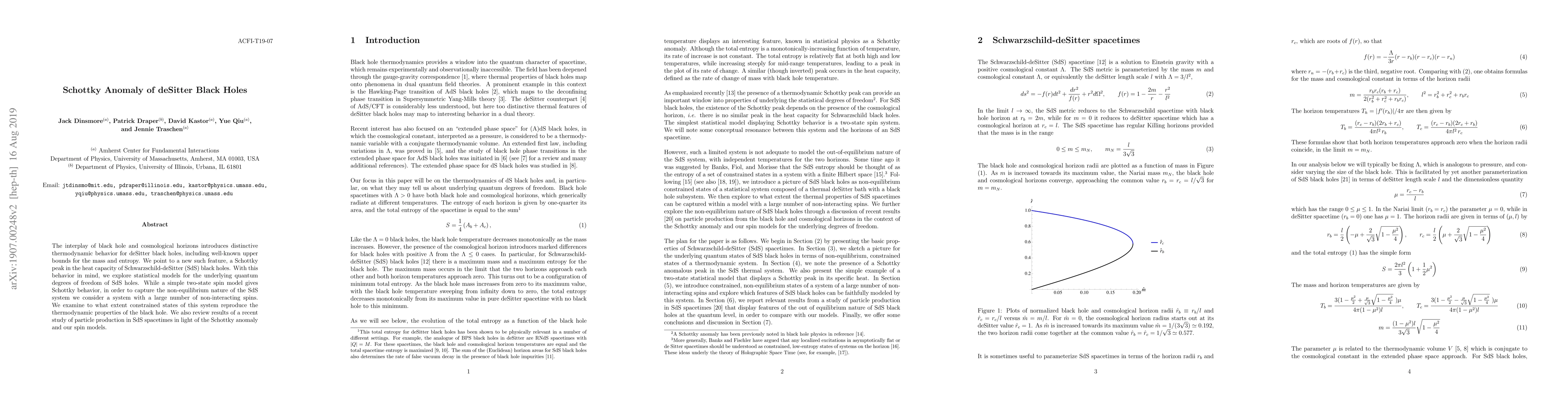 The interplay of black hole and cosmological horizons introduces distinctive thermodynamic behavior for deSitter black holes, including well-known upper bounds for the mass and entropy. We point to a new such feature, a Schottky peak in the heat capacity of Schwarzschild-deSitter (SdS) black holes. With this behavior in mind, we explore statistical models for the underlying quantum degrees of freedom of SdS holes. While a simple two-state spin model gives Schottky behavior, in order to capture the non-equilibrium nature of the SdS system we consider a system with a large number of non-interacting spins. We examine to what extent constrained states of this system reproduce the thermodynamic properties of the black hole. We also review results of a recent study of particle production in SdS spacetimes in light of the Schottky anomaly and our spin models.