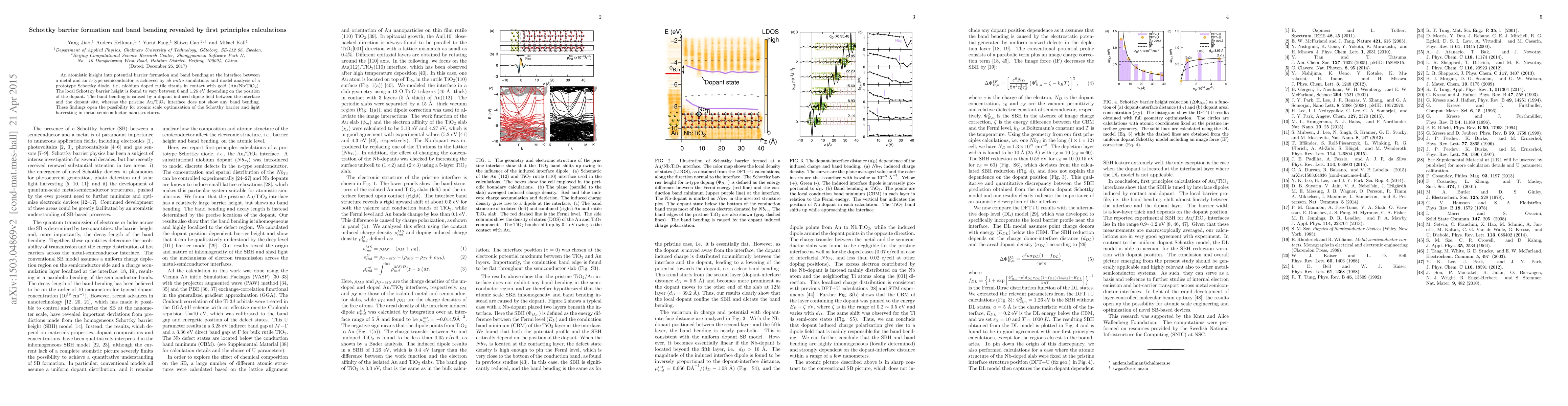 An atomistic insight into potential barrier formation and band bending at the interface between a metal and an n-type semiconductor is achieved by ab initio simulations and model analysis of a prototype Schottky diode, i.e., niobium doped rutile titania in contact with gold (Au/Nb:TiO$_2$). The local Schottky barrier height is found to vary between 0 and 1.26 eV depending on the position of the dopant. The band bending is caused by a dopant induced dipole field between the interface and the dopant site, whereas the pristine Au/TiO$_2$ interface does not show any band bending. These findings open the possibility for atomic scale optimization of the Schottky barrier and light harvesting in metal-semiconductor nanostructures.