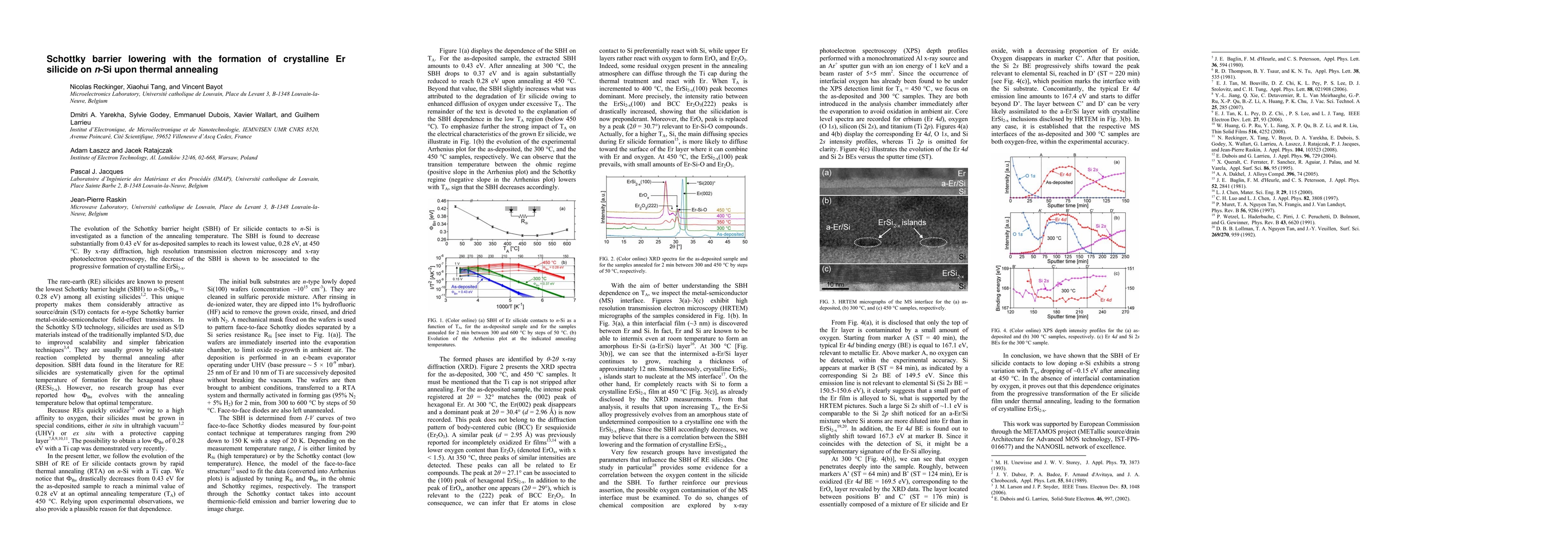 This study investigates how annealing affects the Schottky barrier height (SBH) of Er silicide contacts on n-Si, finding it drops from 0.43 eV to 0.28 eV at 450°C, linked to the formation of crystalline ErSi2-x. Techniques like x-ray diffraction and TEM confirm the structural changes.