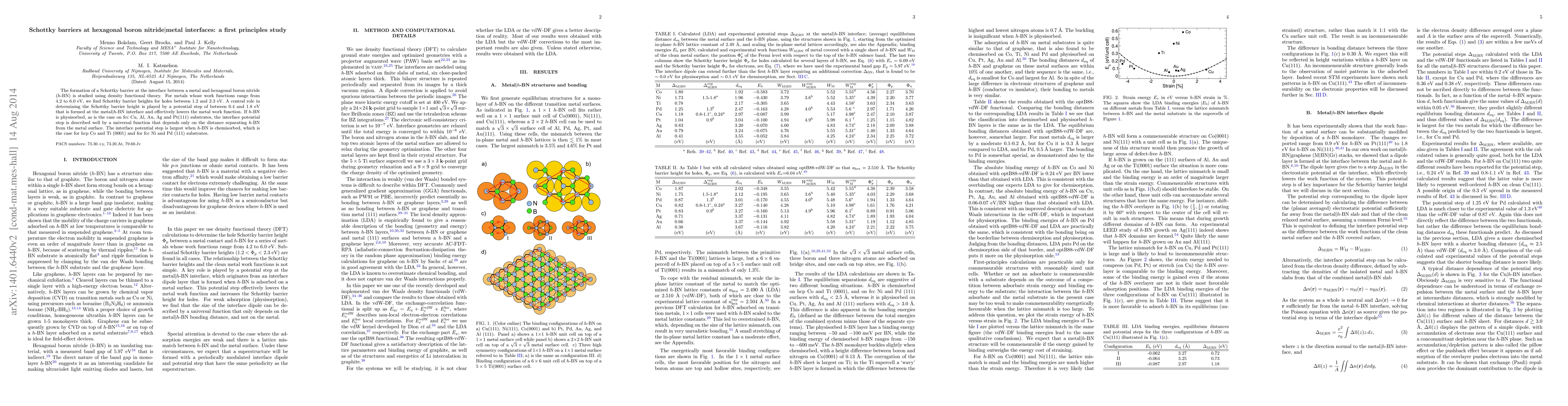 Researchers used density functional theory to study Schottky barriers at hexagonal boron nitride/metal interfaces, finding that the barrier height depends on a potential step formed at the interface, which is largest when h-BN is chemisorbed.