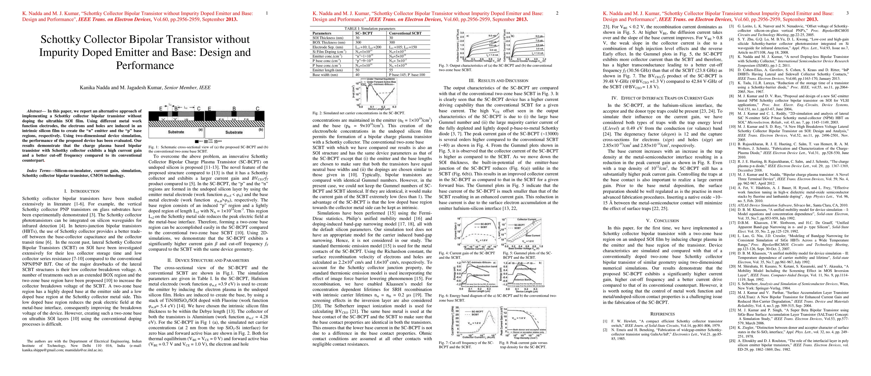 This paper presents a novel Schottky collector bipolar transistor design that avoids impurity doping in the emitter and base, utilizing different metal work functions to induce n and p regions in an intrinsic silicon film. Simulation results show the device has a high current gain and superior cut-off frequency compared to conventional bipolar transistors.