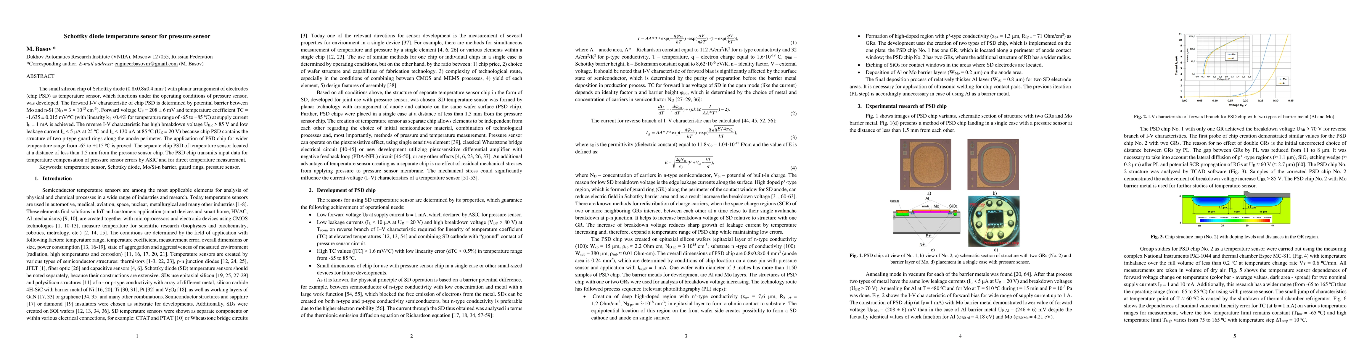 The small silicon chip of Schottky diode (0.8x0.8x0.4 mm3) with planar arrangement of electrodes (chip PSD) as temperature sensor, which functions under the operating conditions of pressure sensor, was developed. The forward I-V characteristic of chip PSD is determined by potential barrier between Mo and n-Si (ND = 3x1015 cm-3). Forward voltage UF = 208 mV and temperature coefficient TC = -1.635 mV/C (with linearity kT <0.4% for temperature range of -65 to +85 C) at supply current IF = 1 mA is achieved. The reverse I-V characteristic has high breakdown voltage UBR > 85 V and low leakage current IL < 5 {\mu}A at 25 C and IL < 130 {\mu}A at 85 C (UR = 20 V) because chip PSD contains the structure of two p-type guard rings along the anode perimeter. The application of PSD chip for wider temperature range from -65 to +115 C is proved. The separate chip PSD of temperature sensor located at a distance of less than 1.5 mm from the pressure sensor chip. The PSD chip transmits input data for temperature compensation of pressure sensor errors by ASIC and for direct temperature measurement.