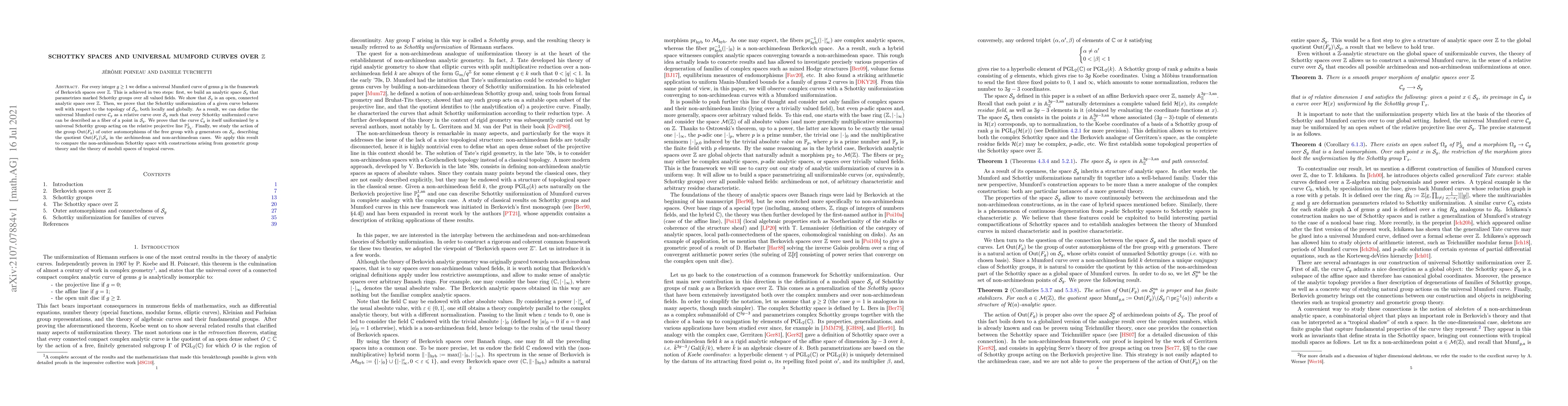 This paper defines a universal Mumford curve of genus $g$ using Berkovich spaces over $\mathbb{Z}$, constructing an analytic space $\mathcal{S}_g$ that parametrizes Schottky groups, and proving that $\mathcal{S}_g$ is an open, connected analytic space over $\mathbb{Z}$. The study concludes by analyzing the action of the outer automorphisms group on $\mathcal{S}_g$ and comparing it with tropical curve moduli spaces.