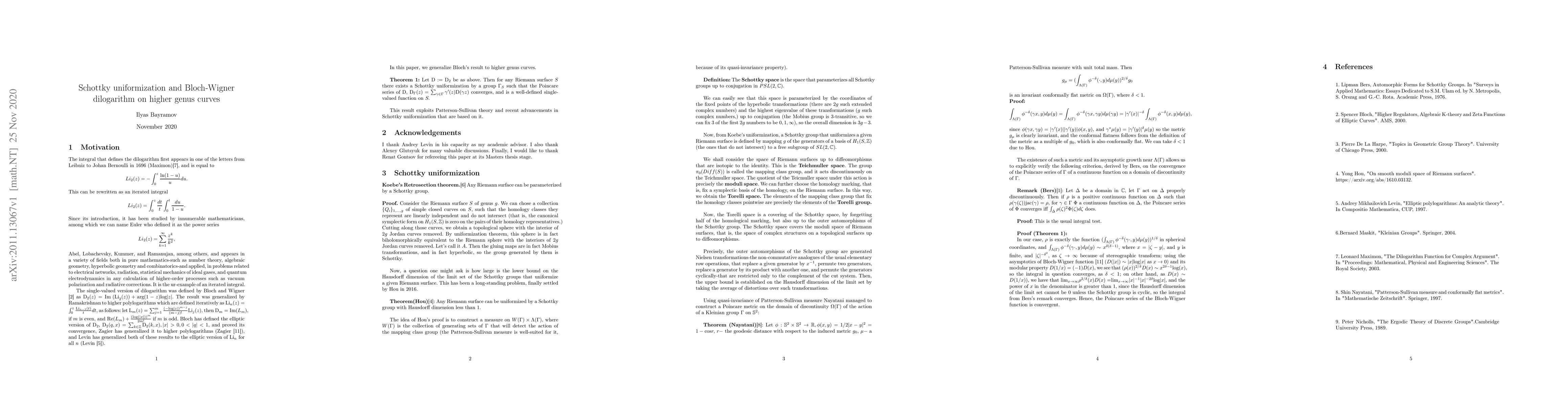 The question of convergence of iterated integrals on Riemann surfaces goes back to Bloch, Levin, and Zagier, who have proved this fact for various iterated integrals in the context of elliptic curves. In this work, I prove the convergence of the iterated integral defining Bloch-Wigner function on higher genus curves, utilizing some novel results of Hou in the theory of Schottky uniformization of Riemann surfaces, as well as some classical results of Bers and more recent results of Nayatani on Poincare metrics on domains of discontinuity of Kleinian groups.