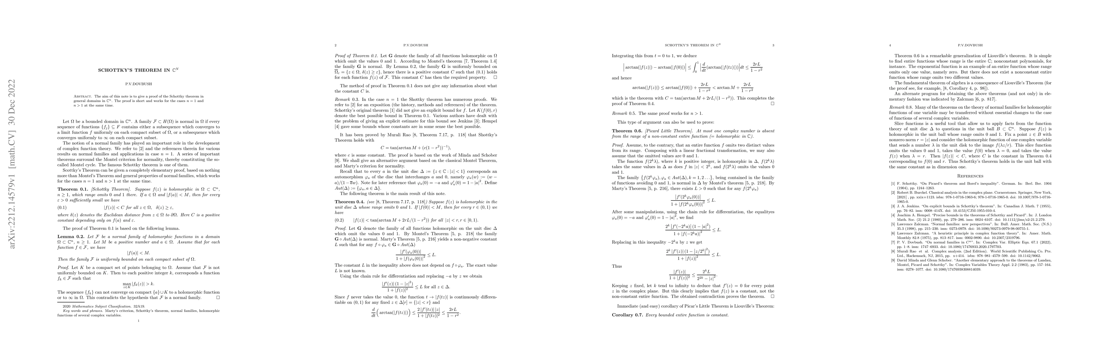 Summary: This paper provides a concise proof of Schottky's theorem applicable to both $\mathbb{C}$ and higher-dimensional complex spaces $\mathbb{C}^n$, demonstrating a unified approach for $n = 1$ and $n > 1$.