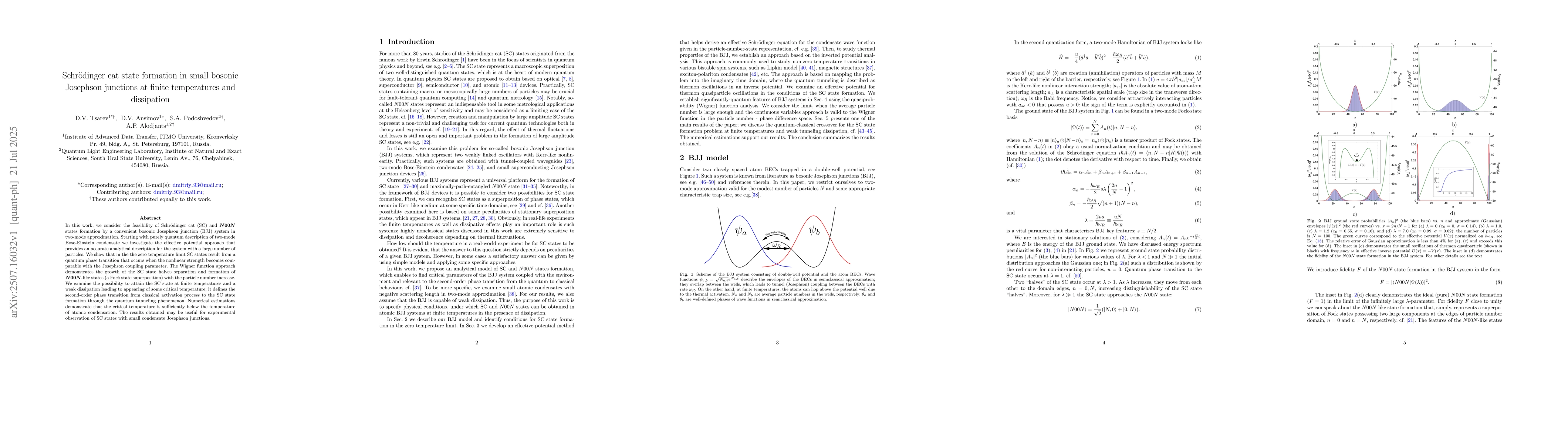 In this work, we consider the feasibility of Schr{\"o}dinger cat (SC) and $N00N$ states formation by a convenient bosonic Josephson junction (BJJ) system in two-mode approximation. Starting with purely quantum description of two-mode Bose-Einstein condensate we investigate the effective potential approach that provides an accurate analytical description for the system with a large number of particles. We show that in the zero temperature limit SC states result from a quantum phase transition that occurs when the nonlinear strength becomes comparable with the Josephson coupling parameter. The Wigner function approach demonstrates the growth of the SC state halves separation and formation of $N00N$-like states (a Fock state superposition) with the particle number increase. We examine the possibility to attain the SC state at finite temperatures and a weak dissipation leading to appearing of some critical temperature; it defines the second-order phase transition from classical activation process to the SC state formation through the quantum tunneling phenomenon. Numerical estimations demonstrate that the critical temperature is sufficiently below the temperature of atomic condensation. The results obtained may be useful for experimental observation of SC states with small condensate Josephson junctions.