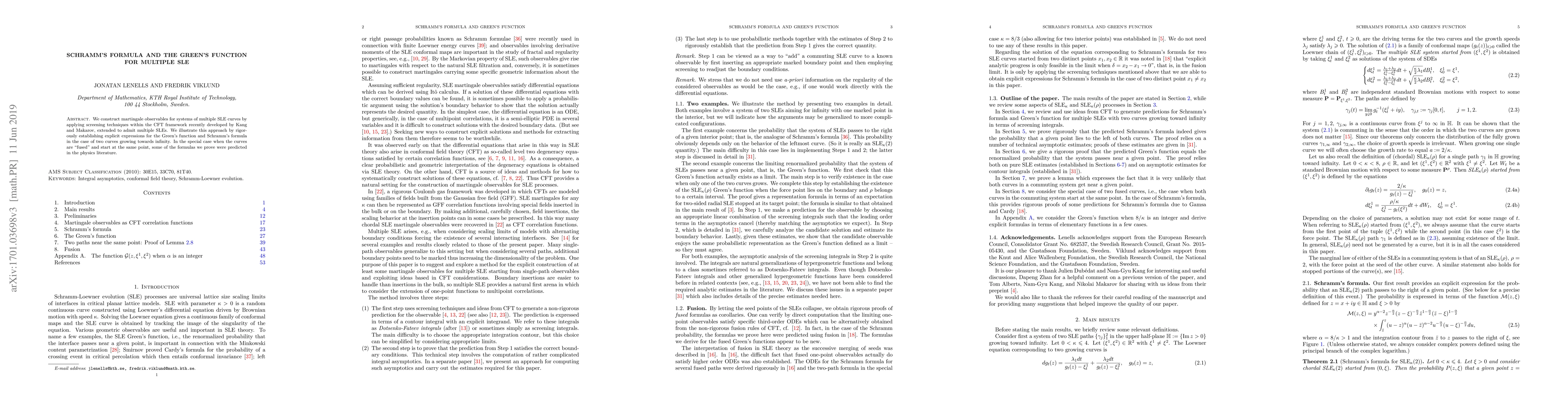 This paper constructs martingale observables for multiple SLE curves using screening techniques within the CFT framework, establishing explicit expressions for the Green's function and Schramm's formula for two curves growing towards infinity, with special cases matching predictions from physics.