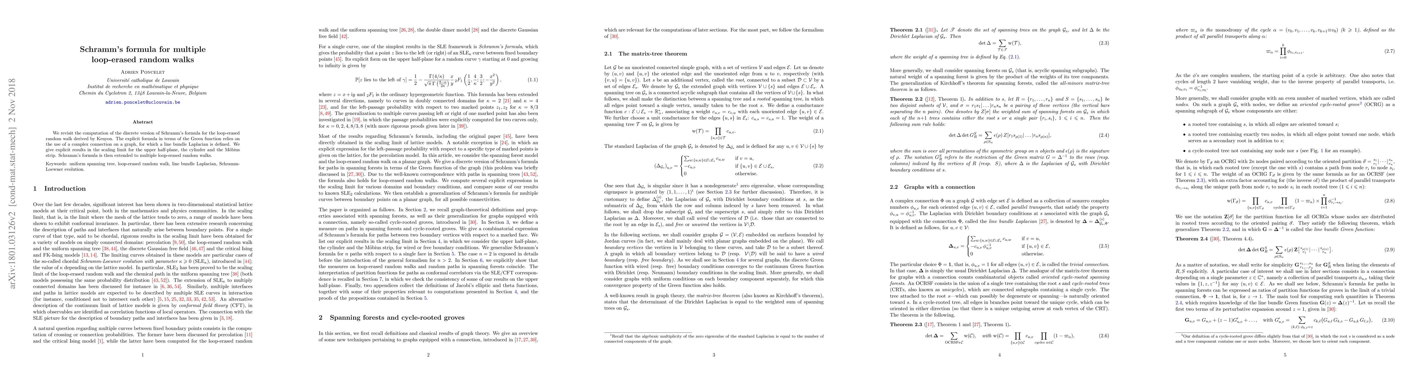 We revisit the computation of the discrete version of Schramm's formula for the loop-erased random walk derived by Kenyon. The explicit formula in terms of the Green function relies on the use of a complex connection on a graph, for which a line bundle Laplacian is defined. We give explicit results in the scaling limit for the upper half-plane, the cylinder and the Moebius strip. Schramm's formula is then extended to multiple loop-erased random walks.