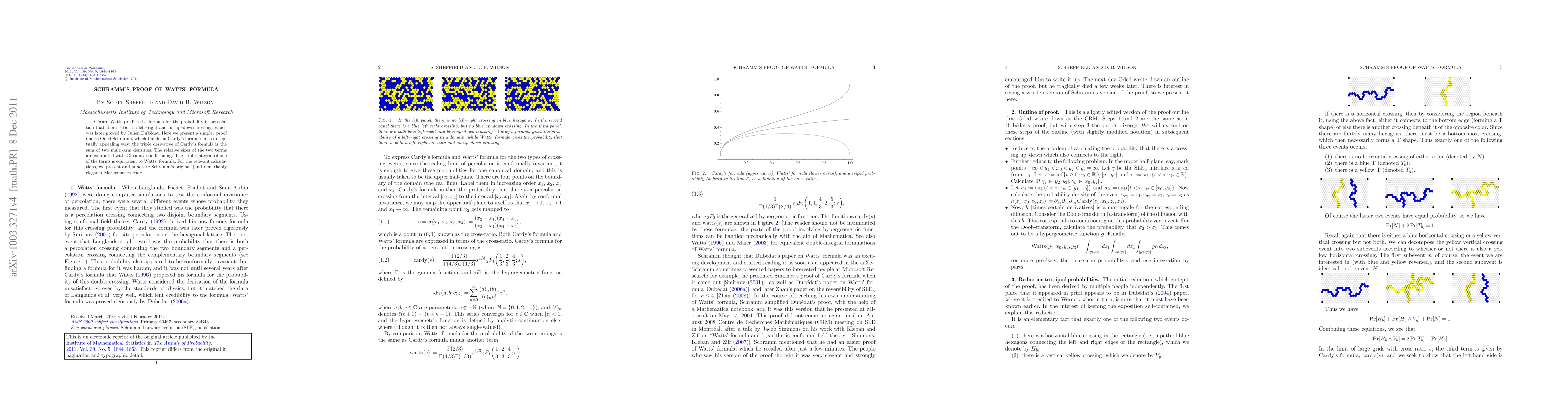 G\'{e}rard Watts predicted a formula for the probability in percolation that there is both a left--right and an up--down crossing, which was later proved by Julien Dub\'{e}dat. Here we present a simpler proof due to Oded Schramm, which builds on Cardy's formula in a conceptually appealing way: the triple derivative of Cardy's formula is the sum of two multi-arm densities. The relative sizes of the two terms are computed with Girsanov conditioning. The triple integral of one of the terms is equivalent to Watts' formula. For the relevant calculations, we present and annotate Schramm's original (and remarkably elegant) Mathematica code.