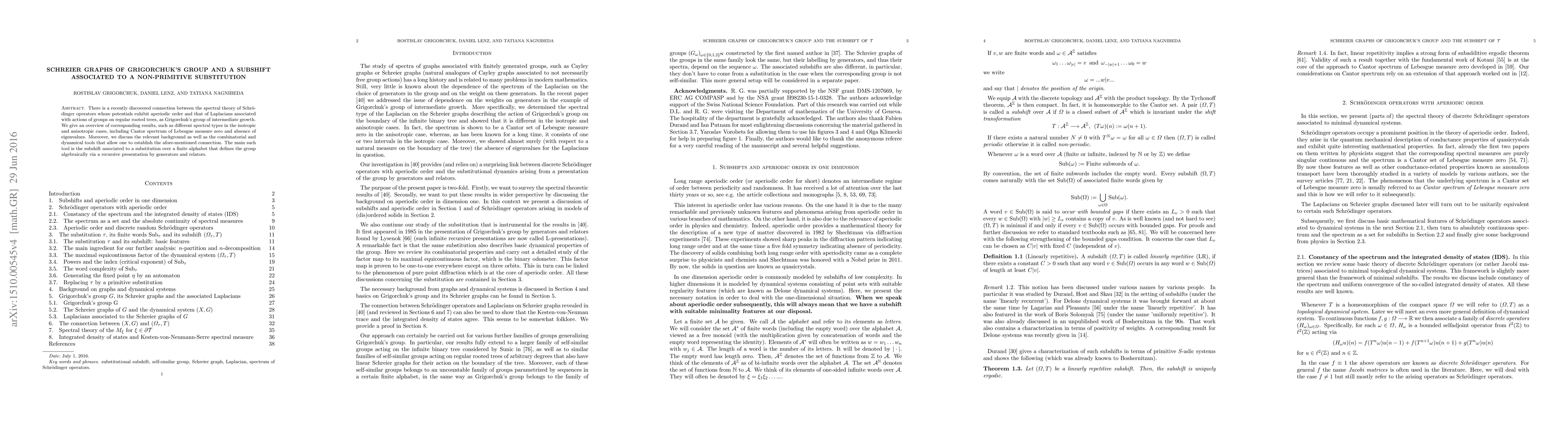 This paper explores the spectral theory of Schrödinger operators linked to aperiodic order and the Laplacians of Grigorchuk's group on regular trees. It highlights spectral differences and the absence of eigenvalues, and discusses the subshift associated with a non-primitive substitution that defines the group.