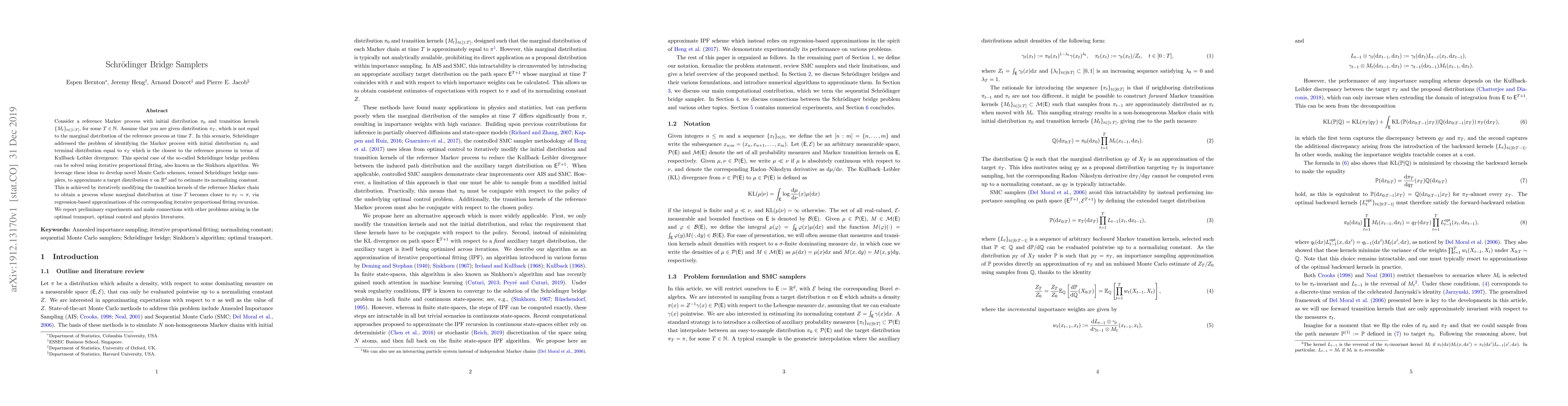 Consider a reference Markov process with initial distribution $\pi_{0}$ and transition kernels $\{M_{t}\}_{t\in[1:T]}$, for some $T\in\mathbb{N}$. Assume that you are given distribution $\pi_{T}$, which is not equal to the marginal distribution of the reference process at time $T$. In this scenario, Schr\"odinger addressed the problem of identifying the Markov process with initial distribution $\pi_{0}$ and terminal distribution equal to $\pi_{T}$ which is the closest to the reference process in terms of Kullback--Leibler divergence. This special case of the so-called Schr\"odinger bridge problem can be solved using iterative proportional fitting, also known as the Sinkhorn algorithm. We leverage these ideas to develop novel Monte Carlo schemes, termed Schr\"odinger bridge samplers, to approximate a target distribution $\pi$ on $\mathbb{R}^{d}$ and to estimate its normalizing constant. This is achieved by iteratively modifying the transition kernels of the reference Markov chain to obtain a process whose marginal distribution at time $T$ becomes closer to $\pi_T = \pi$, via regression-based approximations of the corresponding iterative proportional fitting recursion. We report preliminary experiments and make connections with other problems arising in the optimal transport, optimal control and physics literatures.