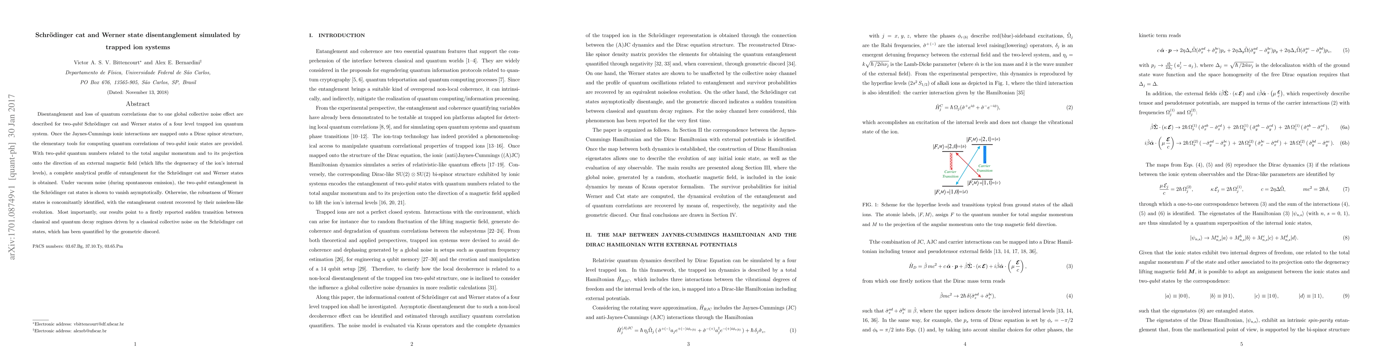 Disentanglement and loss of quantum correlations due to one global collective noise effect are described for two-qubit Schr\"odinger cat and Werner states of a four level trapped ion quantum system. Once the Jaynes-Cummings ionic interactions are mapped onto a Dirac spinor structure, the elementary tools for computing quantum correlations of two-qubit ionic states are provided. With two-qubit quantum numbers related to the total angular momentum and to its projection onto the direction of an external magnetic field (which lifts the degeneracy of the ion's internal levels), a complete analytical profile of entanglement for the Schr\"odinger cat and Werner states is obtained. Under vacuum noise (during spontaneous emission), the two-qubit entanglement in the Schr\"odinger cat states is shown to vanish asymptotically. Otherwise, the robustness of Werner states is concomitantly identified, with the entanglement content recovered by their noiseless-like evolution. Most importantly, our results point to a firstly reported sudden transition between classical and quantum decay regimes driven by a classical collective noise on the Schr\"odinger cat states, which has been quantified by the geometric discord.