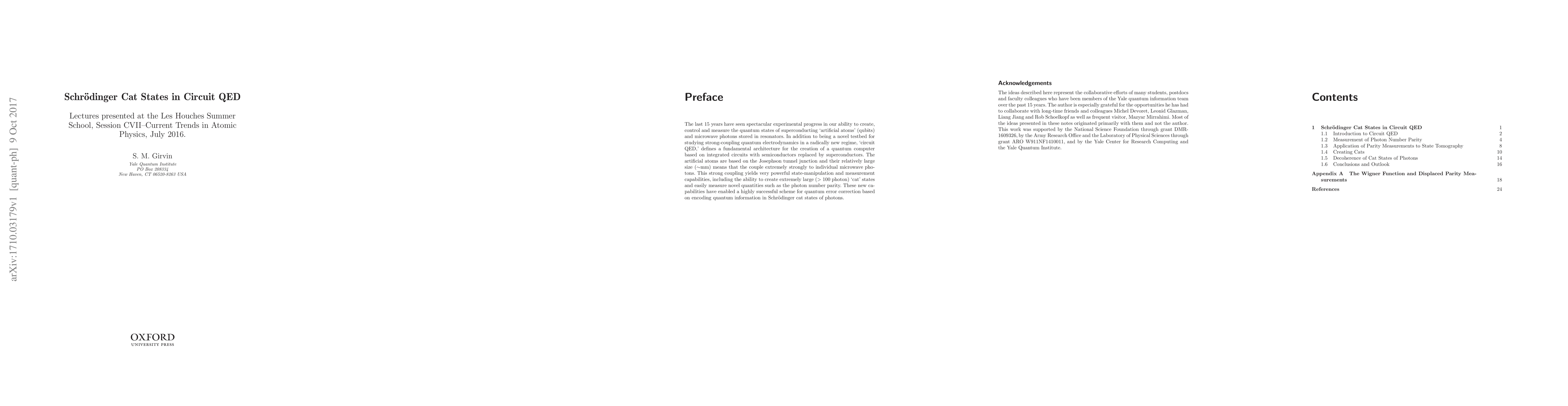 Circuit quantum electrodynamics ('circuit QED') describes the quantum mechanics and quantum field theory of superconducting electrical circuits operating in the microwave regime near absolute zero temperature. It is the analog of cavity QED in quantum optics with the role of the atoms being played by superconducting qubits. The present lecture notes focus primarily on novel quantum states that can be produced and measured using the strong coupling between an artificial atom and one or more cavities. Of particular importance are Schrodinger cat states of photons. Despite long being considered exemplars of frail quantum superpositions that quickly decohere, such states have recently been used as the basis for quantum error correction codes which have reached the long-sought goal of enhancing the lifetime of quantum information through active quantum error correction.