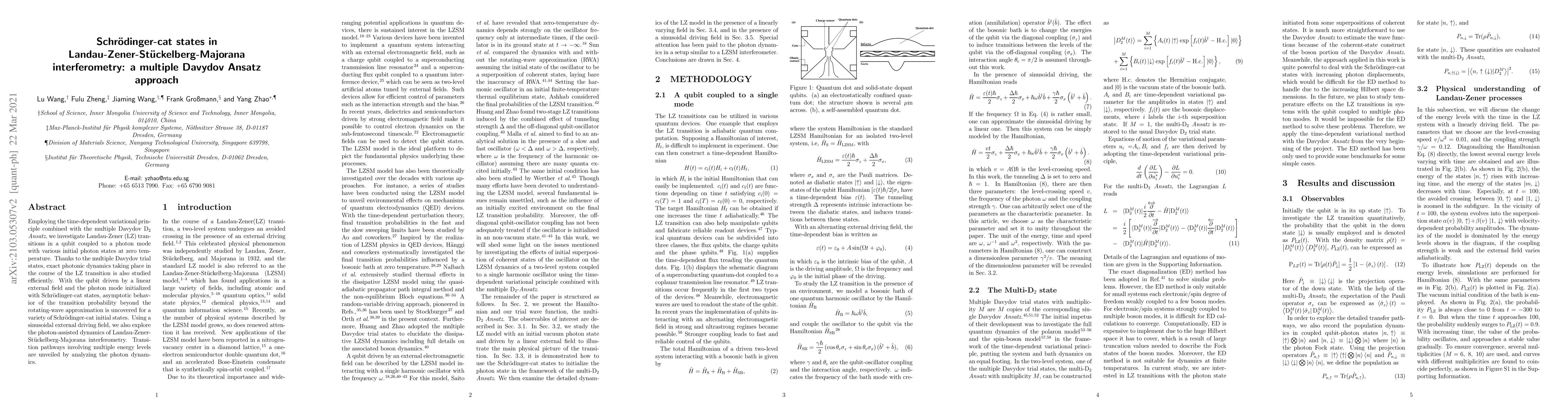 Employing the time-dependent variational principle combined with the multiple Davydov $\mathrm{D}_2$ Ansatz, we investigate Landau-Zener (LZ) transitions in a qubit coupled to a photon mode with various initial photon states at zero temperature. Thanks to the multiple Davydov trial states, exact photonic dynamics taking place in the course of the LZ transition is also studied efficiently. With the qubit driven by a linear external field and the photon mode initialized with Schr\"odinger-cat states, asymptotic behavior of the transition probability beyond the rotating-wave approximation is uncovered for a variety of initial states. Using a sinusoidal external driving field, we also explore the photon-assisted dynamics of Landau-Zener-St\"{u}ckelberg-Majorana interferometry. Transition pathways involving multiple energy levels are unveiled by analyzing the photon dynamics.