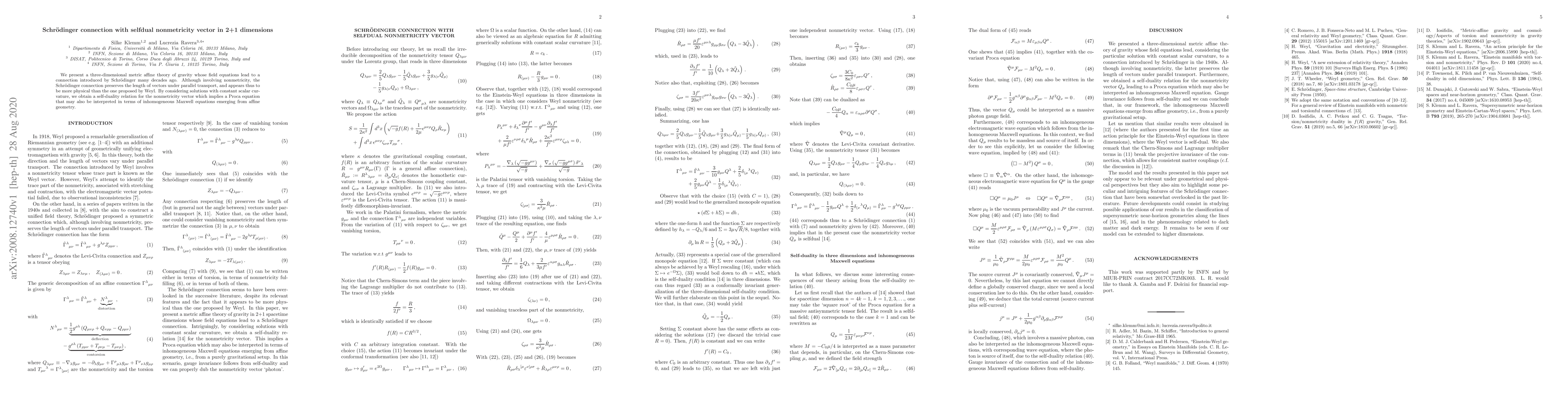 We present a three-dimensional metric affine theory of gravity whose field equations lead to a connection introduced by Schr\"odinger many decades ago. Although involving nonmetricity, the Schr\"odinger connection preserves the length of vectors under parallel transport, and appears thus to be more physical than the one proposed by Weyl. By considering solutions with constant scalar curvature, we obtain a self-duality relation for the nonmetricity vector which implies a Proca equation that may also be interpreted in terms of inhomogeneous Maxwell equations emerging from affine geometry.