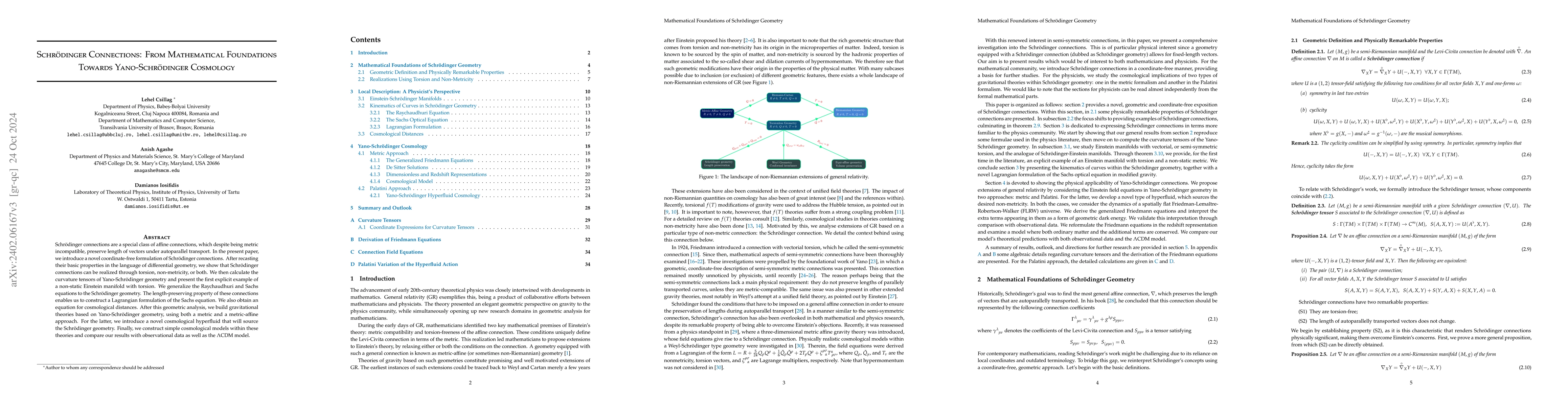 This paper introduces a novel coordinate-free formulation of Schrödinger connections, realizing them through torsion and non-metricity, and proposes a geometric generalization of general relativity based on Yano-Schrödinger geometry. It derives Friedmann equations and tests the theory's feasibility against observational data, suggesting Yano-Schrödinger gravity as a plausible alternative to standard general relativity.